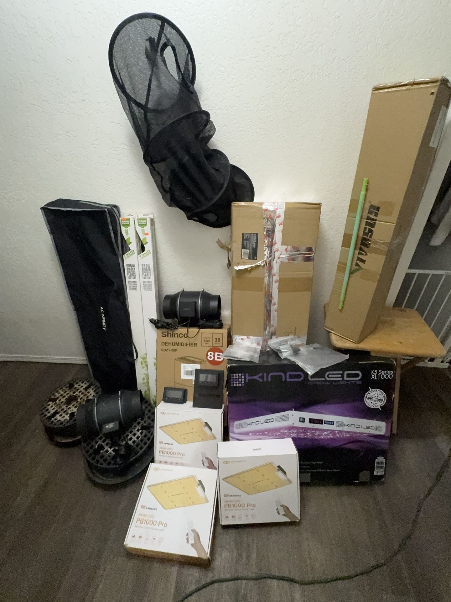 1-ac infinity 48x48x80 grow tent,3-Maxsisun pro 1000, 1-kind led 1000,1-shinco dehumidifier 30/pint 1,500 sq ft,2-ac infinity 6” duct inline fan model AI-CLT6, 1- vivusun 4x2 grow tent,2-54 watt lights,1-mesh net light