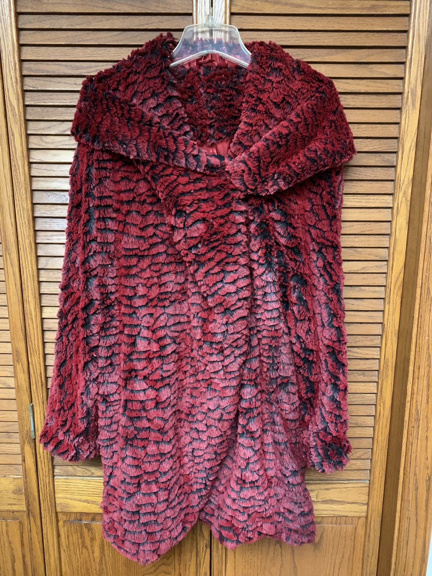 NEW without tags * Women’s size L * Soft cozy plush shearling faux fur cocoon jacket coat * Ruby red with hints of black (see last 2 photos for true color) * Generous shawl collar offers several ways to wear this coat * Side pockets + inside pocket * 4 fur hook closures * Fully lined * Armpit-to-armpit seam 27” across the back * Length 35” * Sherman Oaks / SFValley