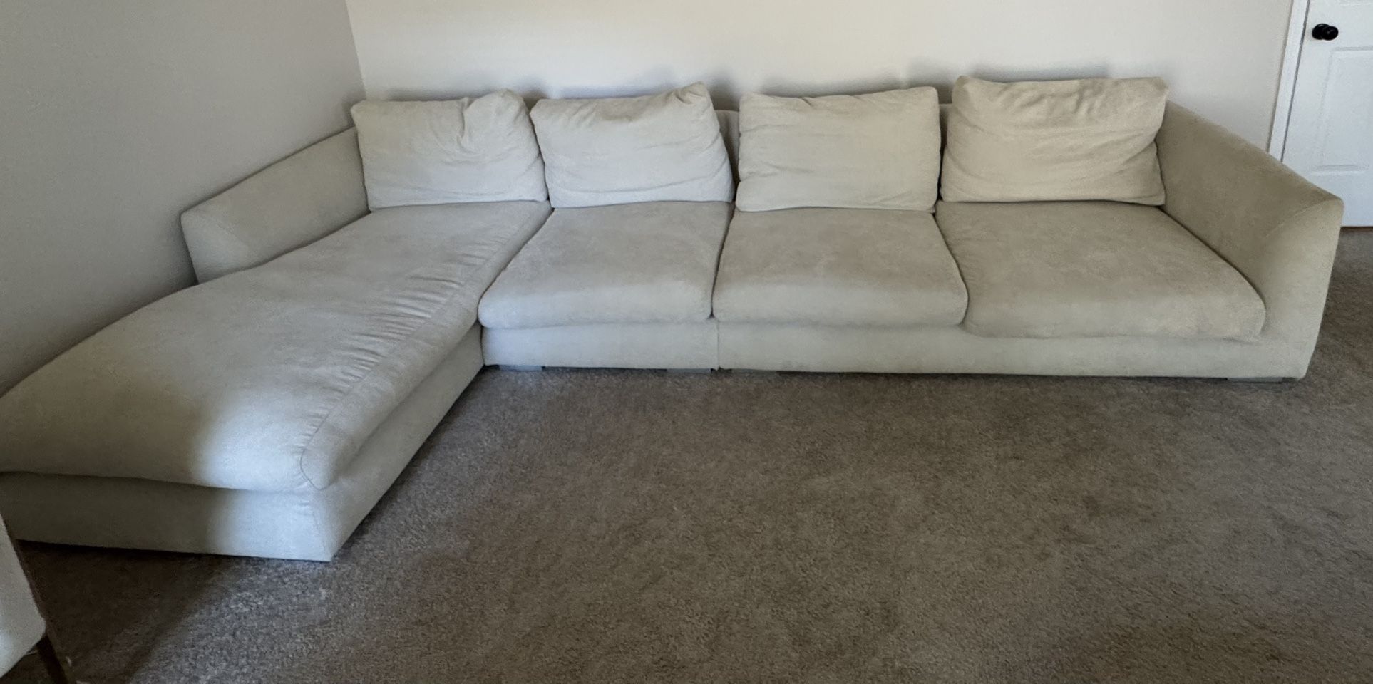 Beautiful modern cream/ivory sectional sofa with chaise for sale. It has a clean, minimalist design and is very comfortable and spacious—perfect for a living room or family room. • Used for 2 years • Chaise lounge for extra comfort • Seat cushions are secured with Velcro, so they stay in place and do not slide around • Removable cushion covers – the fabric can be taken off and washed • Comes with 4 matching 12x12 throw pillows • Soft, durable fabric • Deep seating, great for relaxing or lounging • Neutral color that fits many décor styles The sofa has been well cared for and is still in great condition. Pickup only.