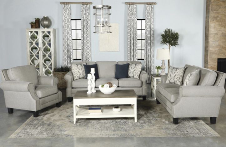 Modern farmhouse style textured grey fabric with antique small and medium nail head trim and block feet fashioned of black finish wood Dimensions: Sofa - 86.5"L X 37.5"W X 35.75"H Loveseat - 63"L X 37.5"W X 35.75"H Add Chair: $450 Best Prices in the Industry Guaranteed! - COA *No Tax *Pickup in Tracy by Appt *We Can Deliver