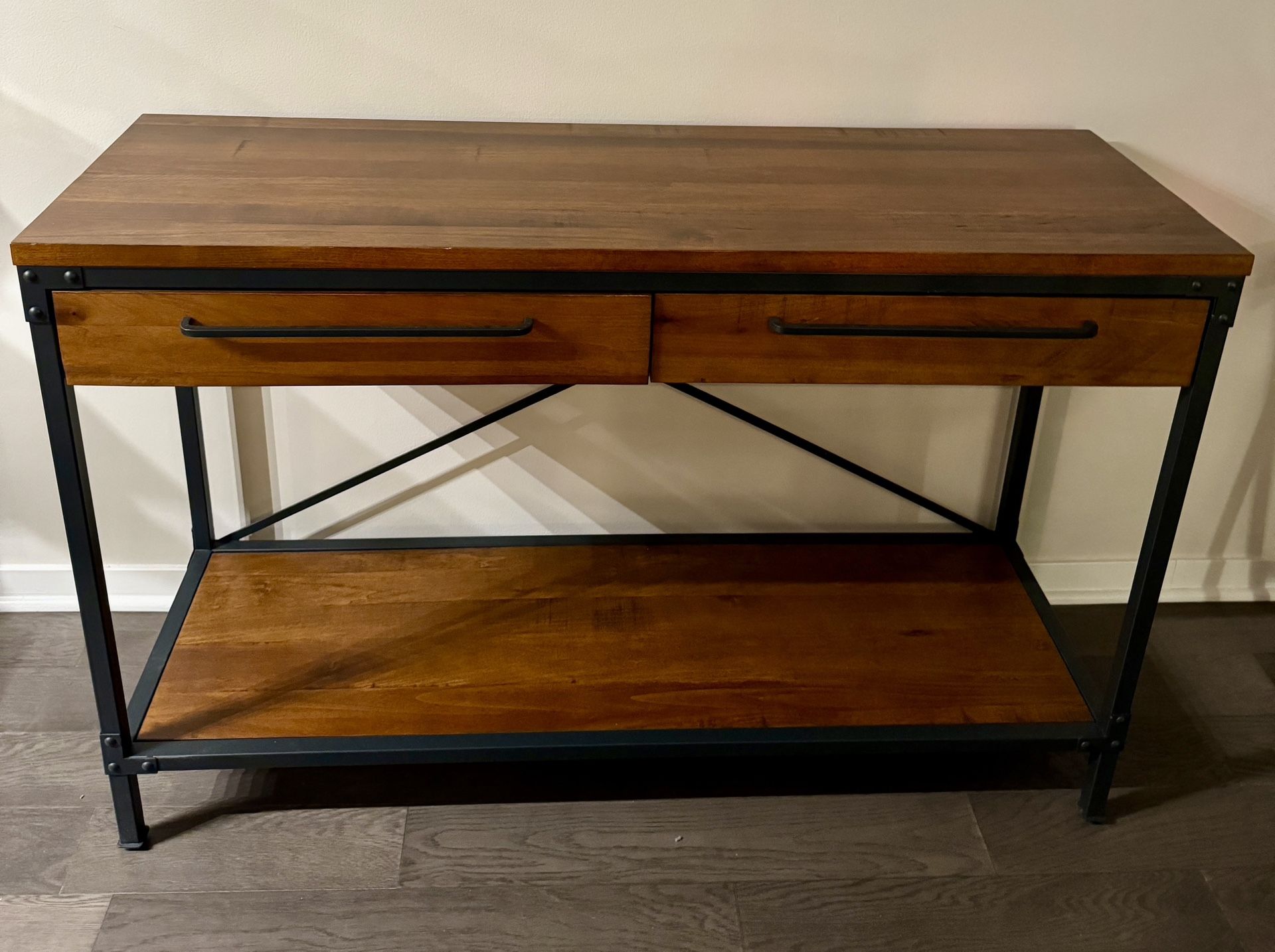 Excellent condition. Expertly crafted from solid American poplar with a natural antique stain, the Insigna Console Table adds rustic industrial style to your space. The rich, modern aesthetic is completed with refined metal frame, legs and drawer pulls. Two large drawers feature smooth-glide runners. DIMENSIONS 50"W x 17"D x 32.25"H