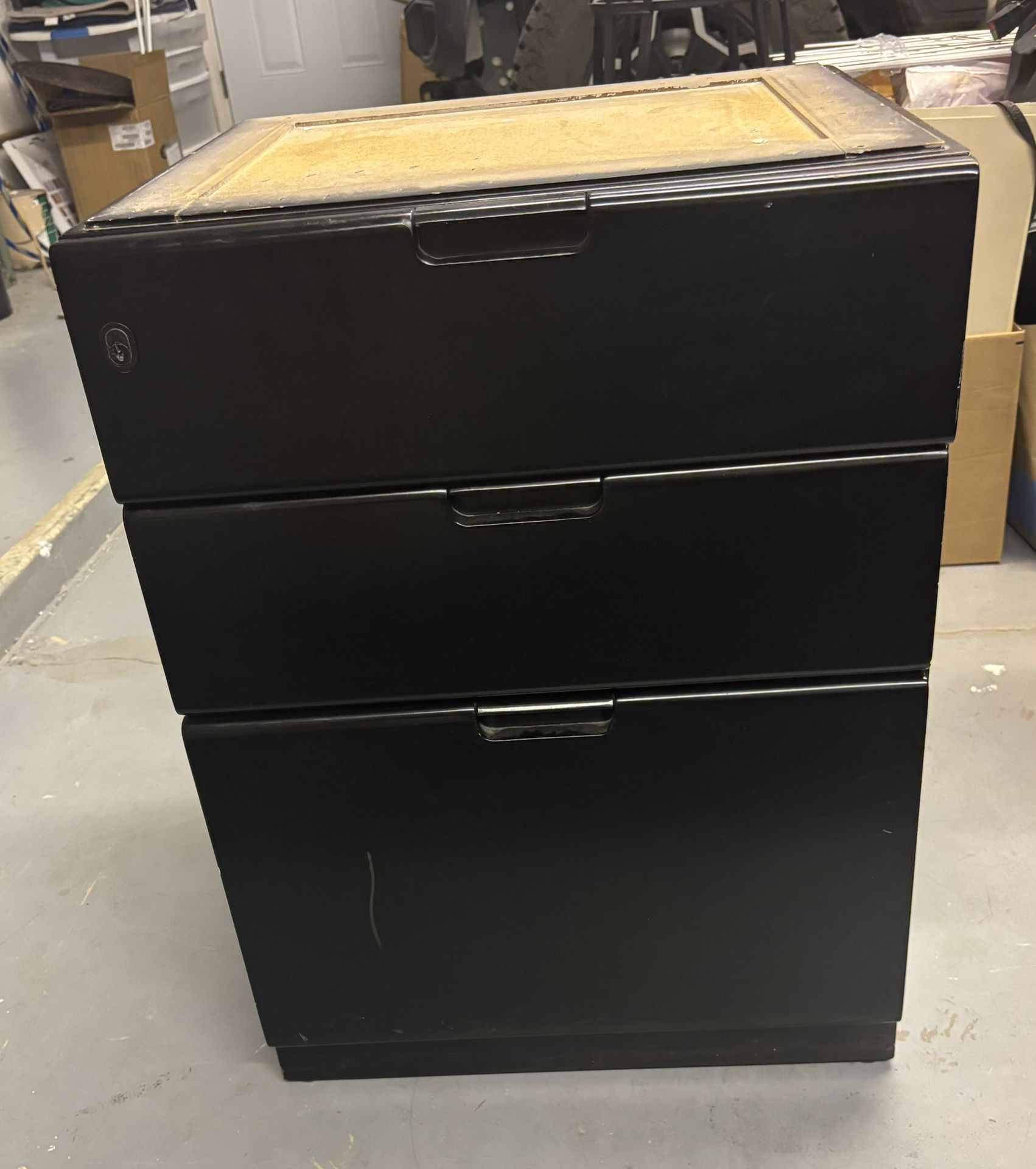 Black legal size filing cabinet with 2 drawers. Very well made, smooth glides and sturdy. Comes with several legal file folders. This is designed to install under a counter/desk, but I used it to put my printer on. 26.25”h x 19.5”w x 19.5”d