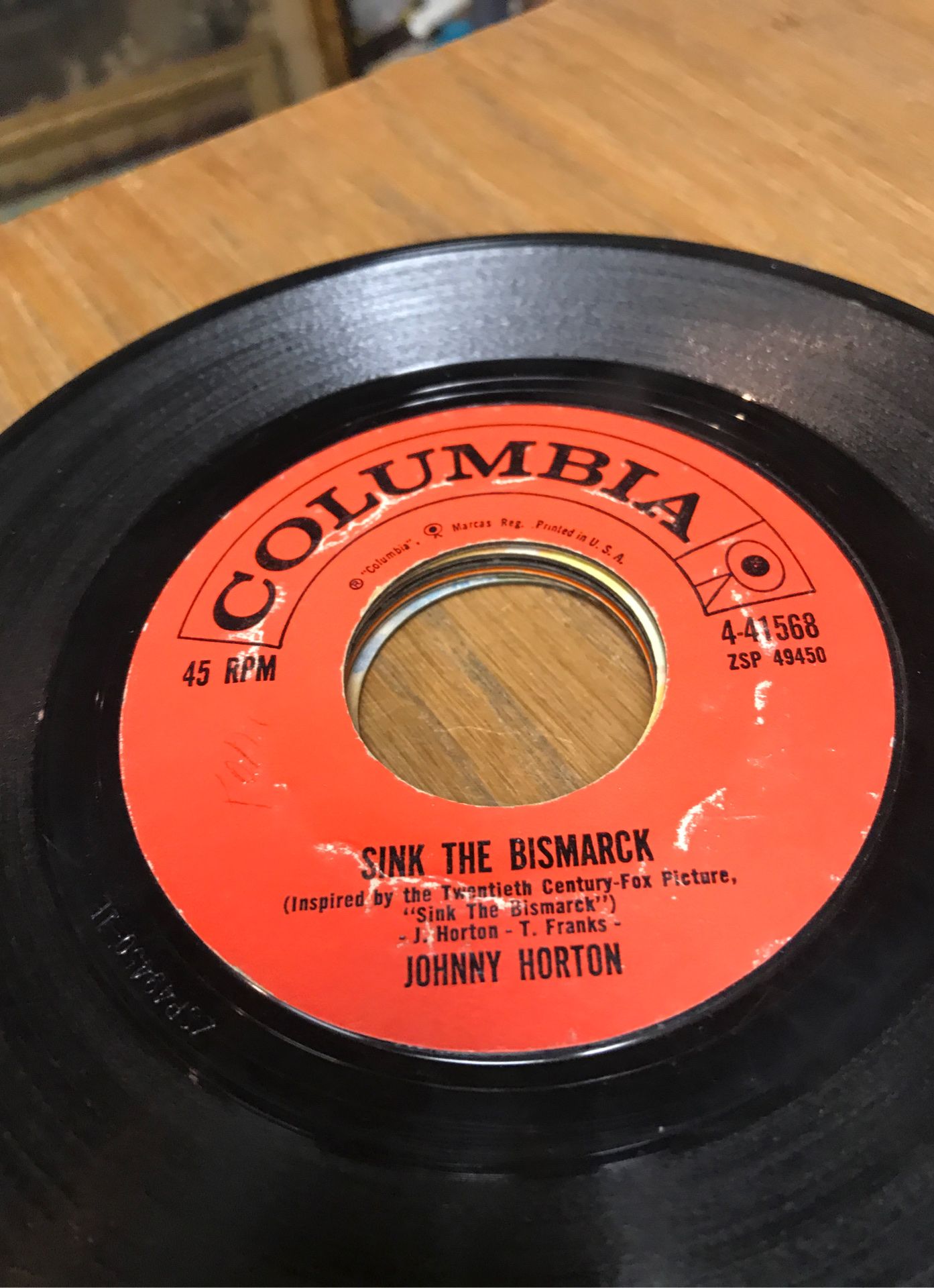 5 Old 45 rpm’s, Sink The Bismarck (Johnny Horton, Don’t Say You Don’t Remember (Beverly Bremen’s), Play Me A Hutton’ Tune (Perry Como), Action (Fredd