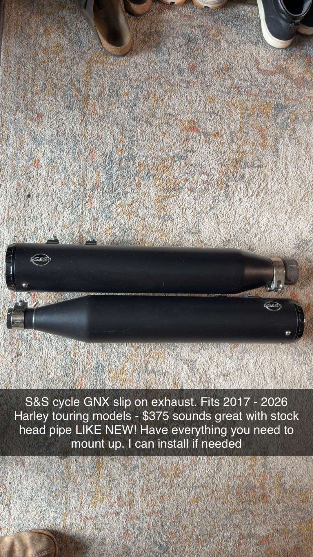 Like new!! Less than 10 rides with them on. I have all Lou ting hardware as well as unused baffles. Decided to get full exhaust with new headers. S&S cycle GNX SLIP ONS sound amazing with the stock heads. Very clean rumble sounds mean but not too loud.