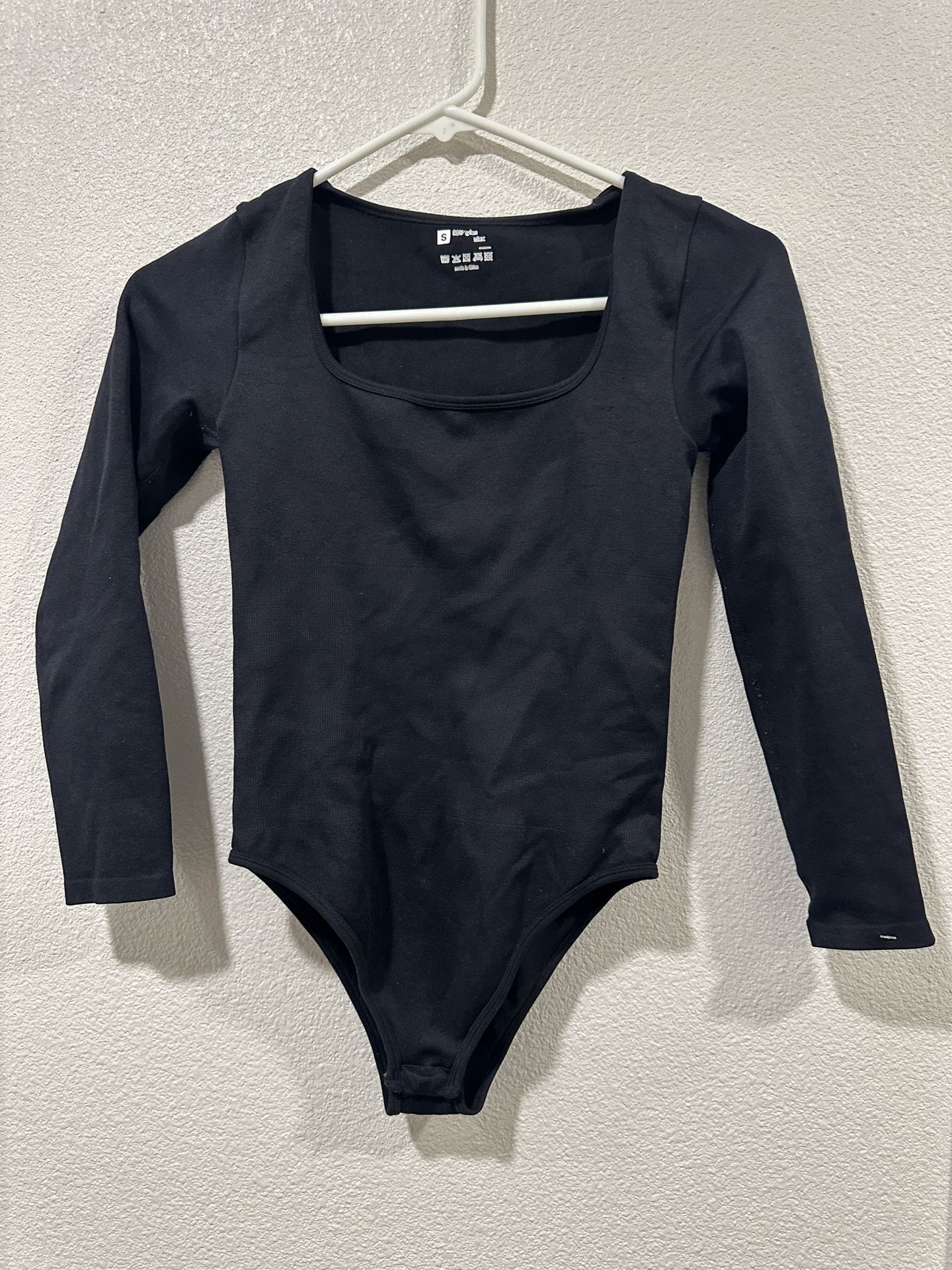 A knit bodysuit featuring a square-cut neck, long sleeves, and snap-button closures. Black Small Like new Fitted Women top