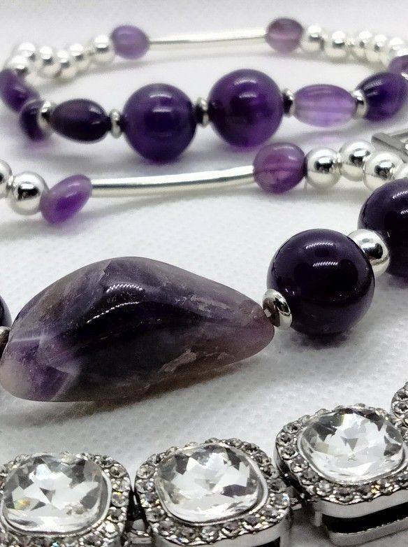 Very Sparkling Crystals and Amethyst Gemstone Bracelets Set of 3.