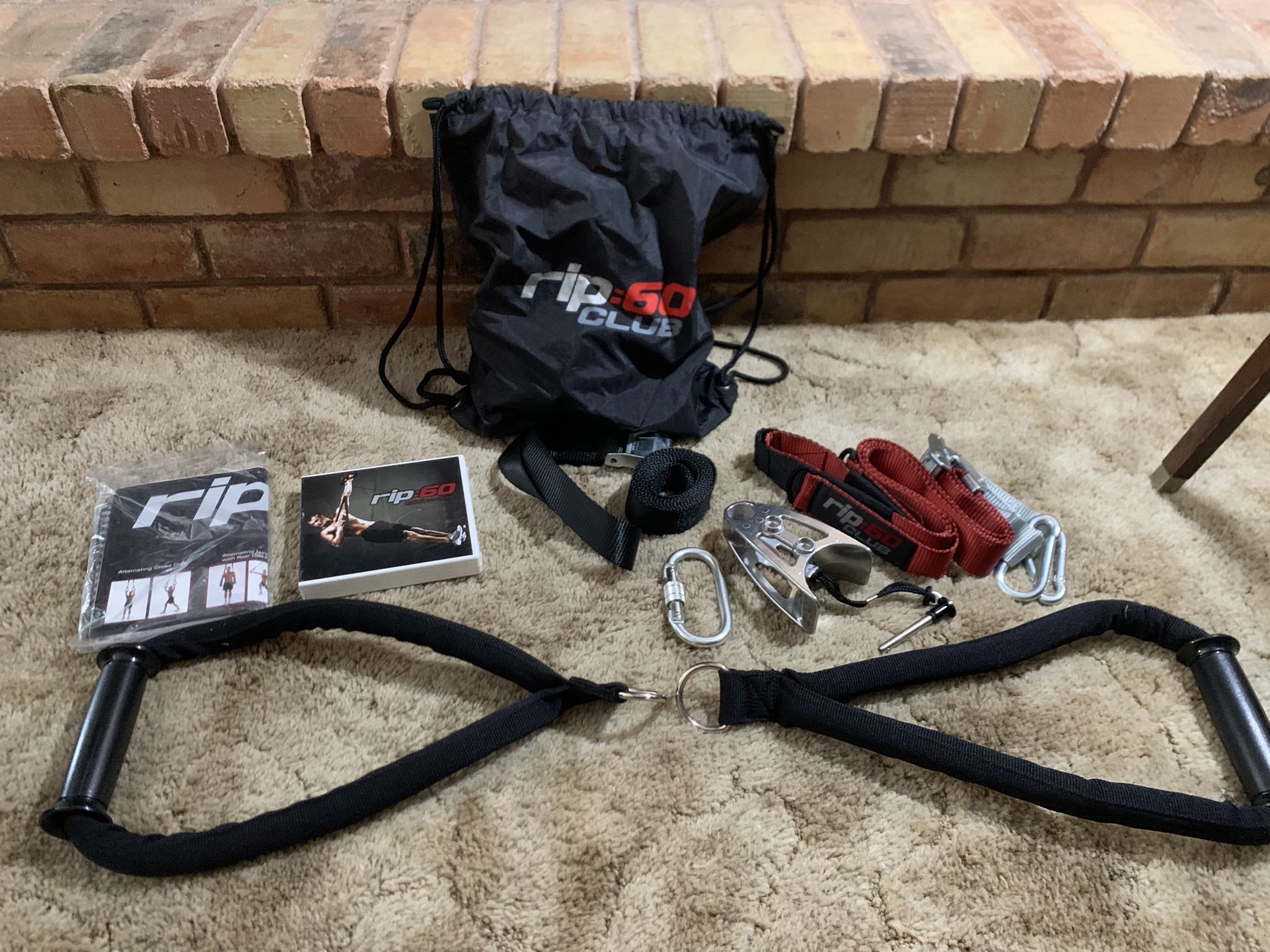 RIP 60 Suspension Trainer kit includes: Bodyweight Fitness Resistance Straps Trainer, 12 instructional DVD set, Exercise Poster, Exercise Chart and Nutrition Manual. Never used, brand new! Have four complete sets if interested.