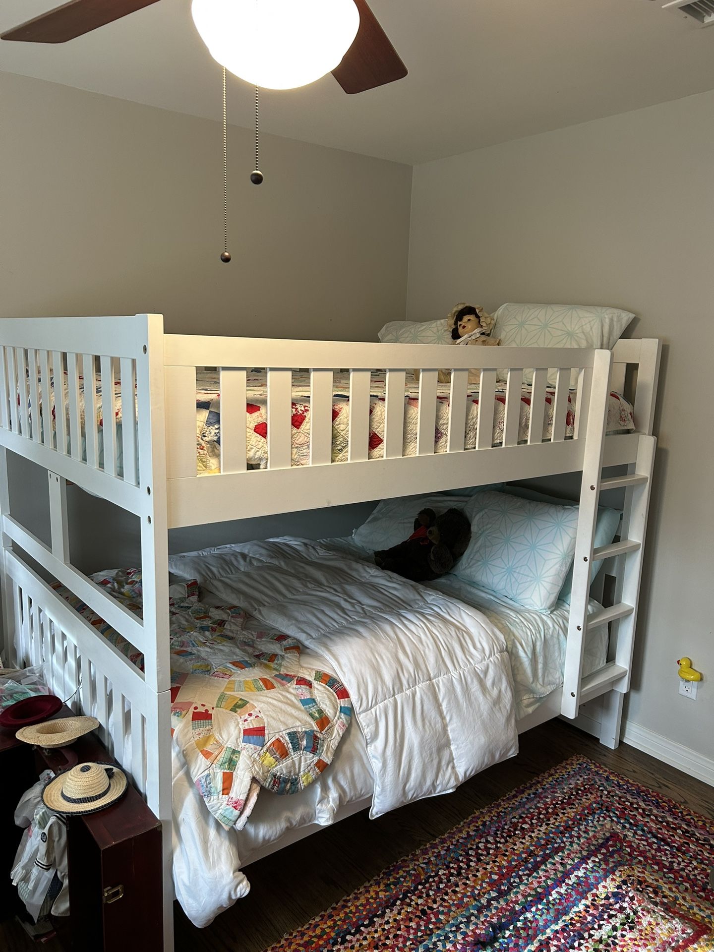Full size mattress, bunk, bed on both top and bottom. Plus a twin trundle. 56 1/2 inches wide by 64 1/2 inches tall White color, perfect condition. Rarely used
