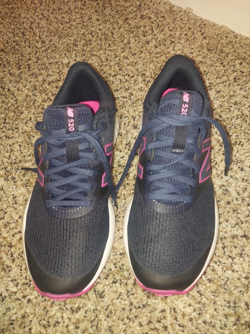New Balance 520 sneakers, specifically the Women's 520 v8 Running Shoe in a navy blue and pink colorway.