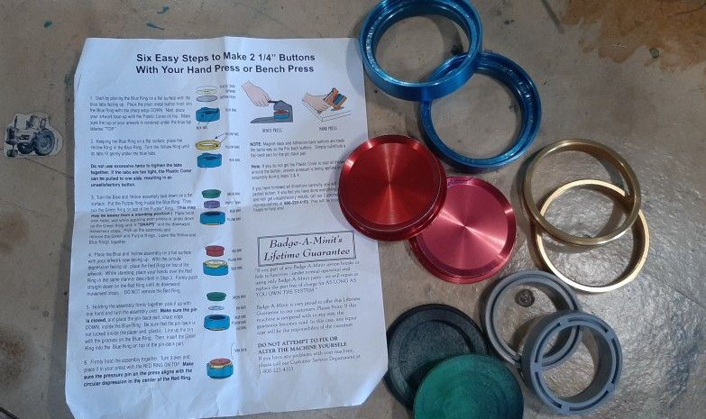 2 1/4" badge / pin maker from Badge-A-Minit Includes: 2 sets of assembly rings Over 100 front and pin backs Bench press Instructions Almost everything you need to make will over 100 personalized pins - does not include plastic cover - only about 3 left.