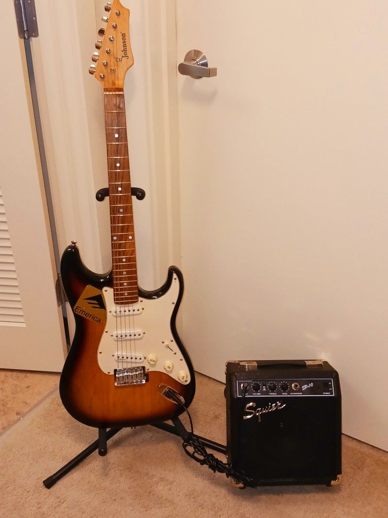 Does vintage guitar sounds mean for 22-year-old guitar it whales sounds beautiful it's as good as the fender stratocasters I have literally sounds amazing has full nickel and Chrome strings and tuning Keys plus strap lock strap connectors full whammy bar of capabilities volume tone* 2 and four-way switch for ultimate sounds the SP Square amplifier is in near mint condition sounds awesome very loud and also has full volume trouble bass and gain controls with distortion pedal built in red LED indicator light and headphone jack beautiful Squier Badge of front from Corona California this set is amazing and cost me $400 when I purchased it sacrifice $200 for everything shown except for this guitar stand as it's for my other guitar cash only no venmo or trades thanks for looking and have a great day text for address thank you