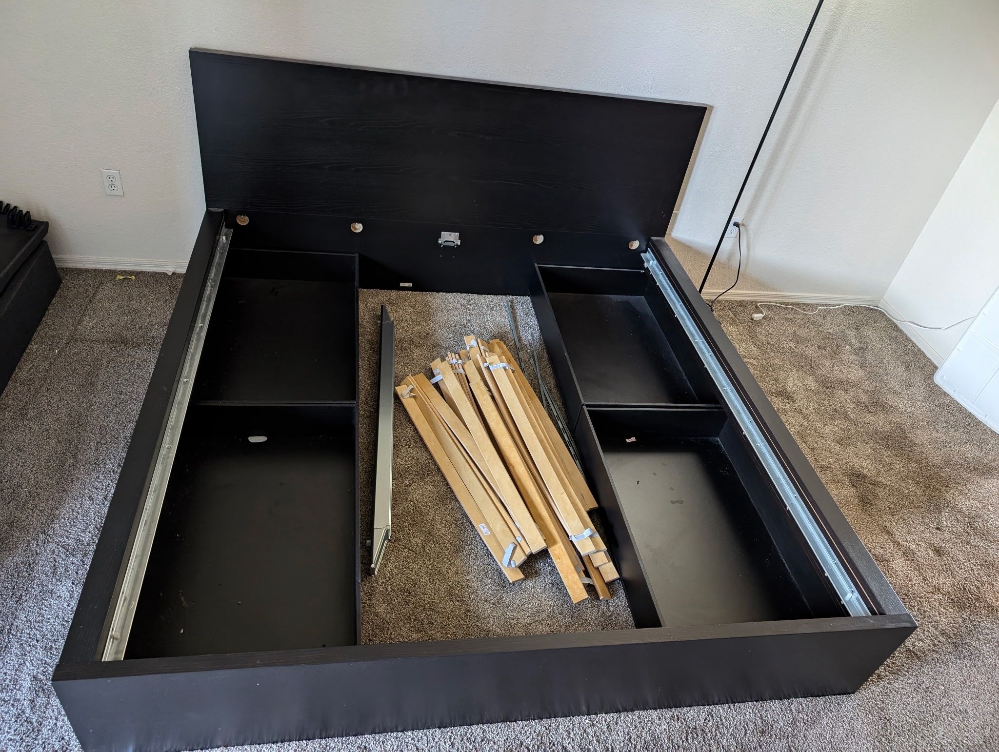 Black wood King bed frame. Has 4 pull out drawers on wheels for under the bed.