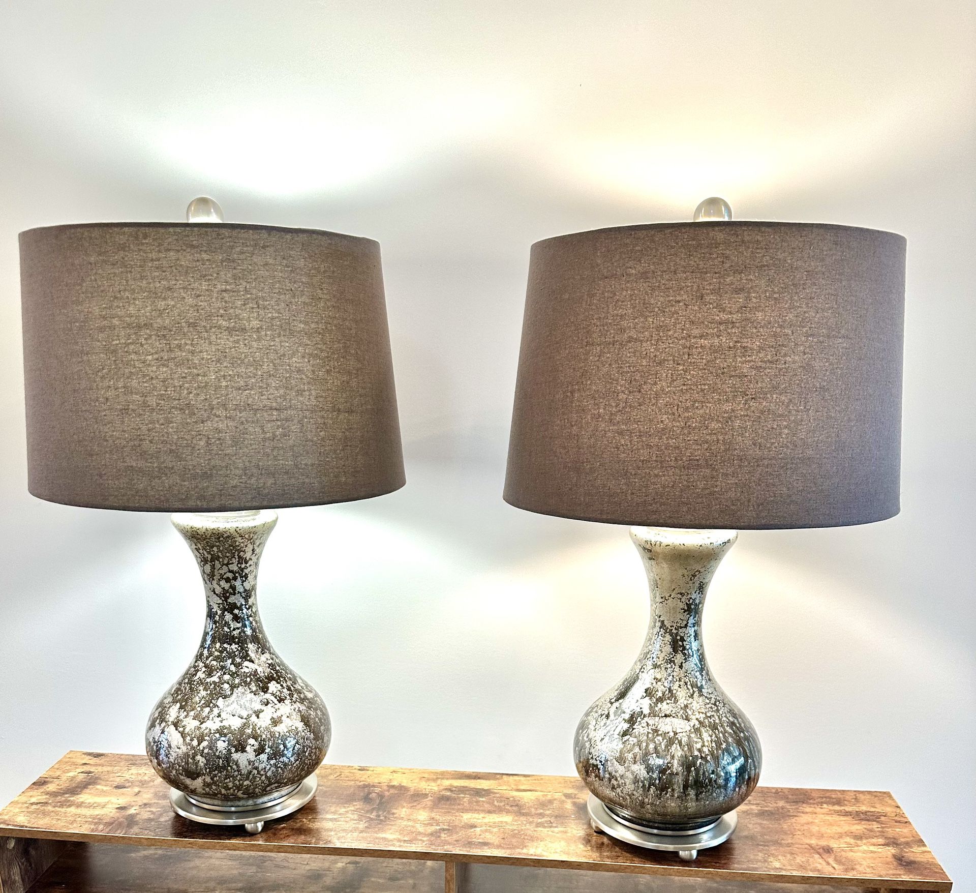 Pair (2) Lazyboy elegant glass table lamps in a gourd shape. Silver-Amythyst in color on a silver base. The amythyst natural linen shades and 3-way socket switches complete this beautiful design. Overall height is 28” with shade. Lazyboy quality lamps in like new condition.