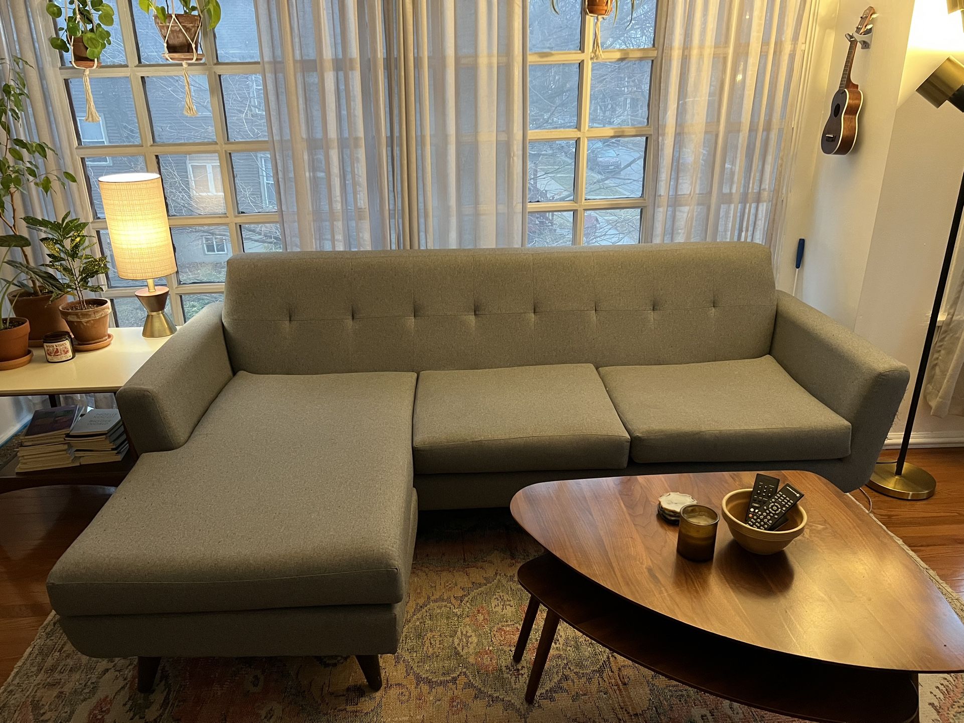 Joybird Hughes Sectional with “Pet Friendly” performance fabric. Color is ash grey with walnut legs. Has been exposed to 3 cats, no dogs or children. NEED GONE ASAP! The good: -Purchased in fall 2021 i.e. newer and tons of life left. -Very firm -Spacious and comfortable -Originally $2300 -Sturdy, very resilient -No sagging or degradation of cusions The meh (all pictured) -Very minor thread showing from cat scratching -A couple water spots, easily cleanable -Tiny burn mark from rogue candle ember 96” W x 34” H x 61” D Local pick up only. Zelle, Venmo, Paypal strongly preferred. You must transport. I will remove couch legs ahead of pickup. Location in North Center. 2nd floor apartment. Again, need this gone asap as we already have a new couch ready to swap out. Sofa couch mcm mid century west elm crate barrel cb2