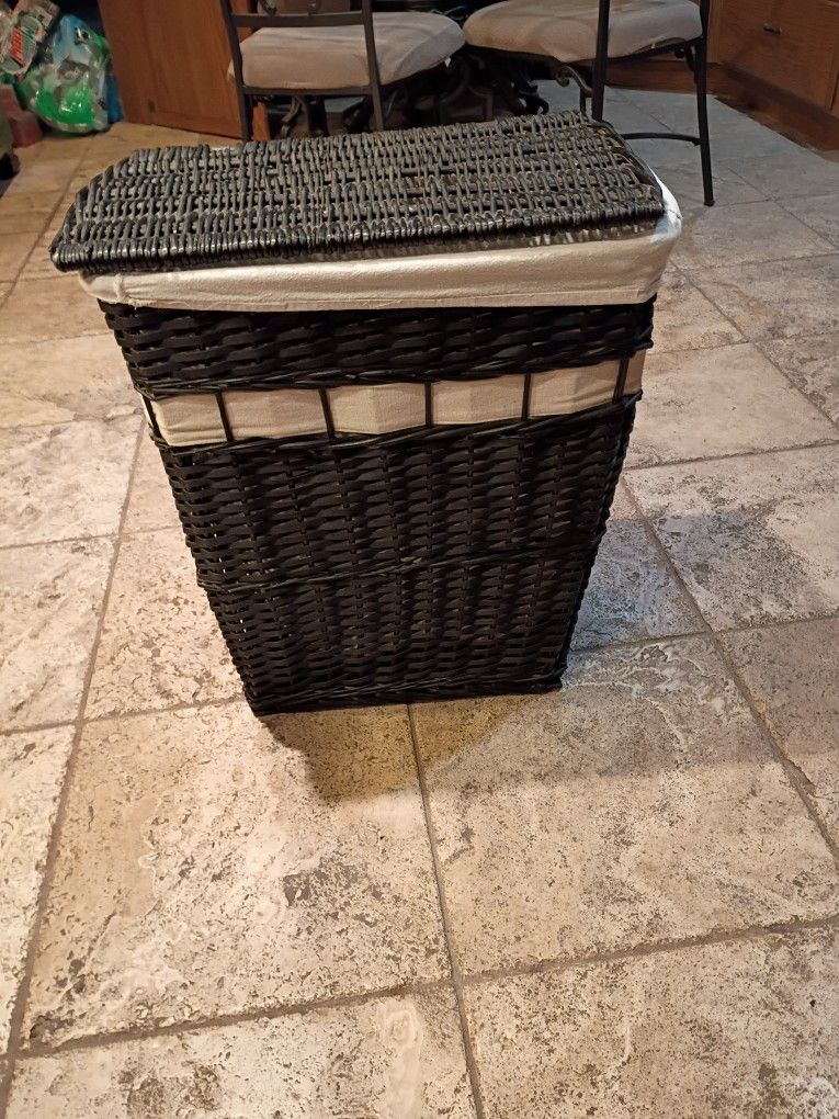 Stylish dark wicker laundry hamper. Has a lid and a removable fabric liner. Liner is washable, super handy for keeping your laundry organized. Very clean and in his shape, I just went to a light color. 2' (24") tall 1' (12") wide 18 1/2" across