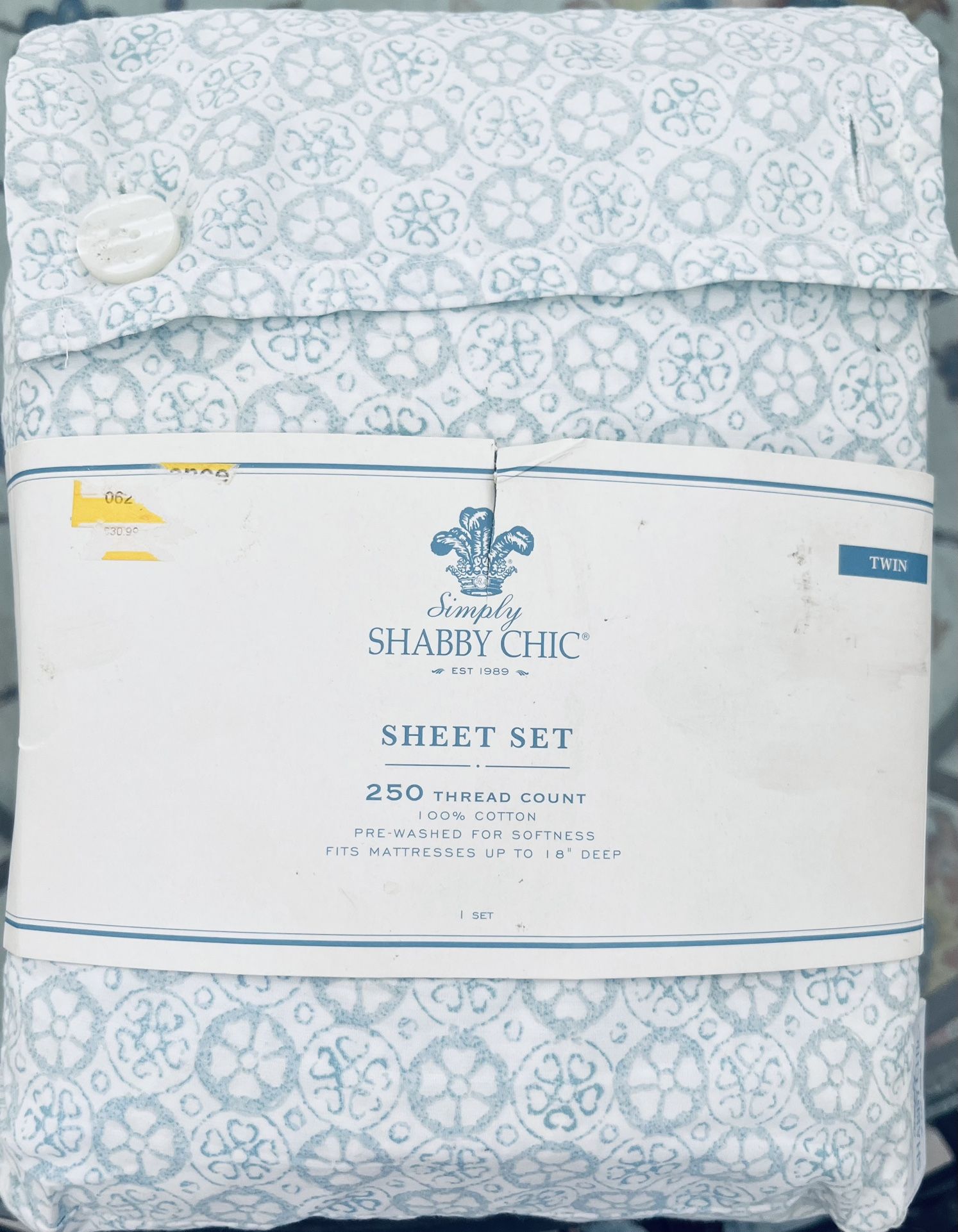 Blue and white twin size sheet set. Includes the flat sheet, fitted sheet, and standard/queen pillowcase