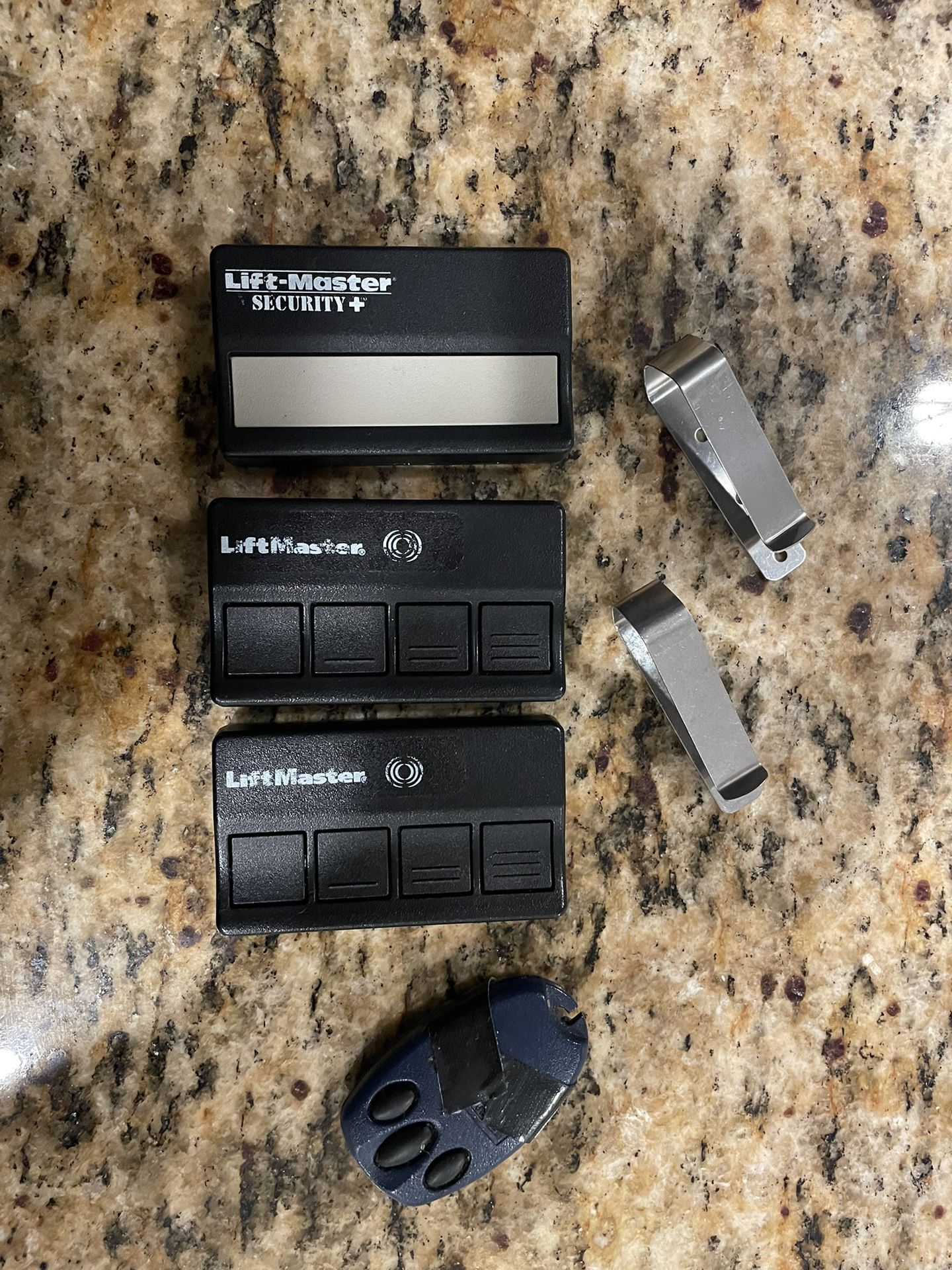 4 Chamberlain/LiftMaster garage door remote openers. 2 - Model# 374LM 1 - Model# 971LM 1 - key fob remote Work most garage door openers by Chamberlain/LiftMaster.