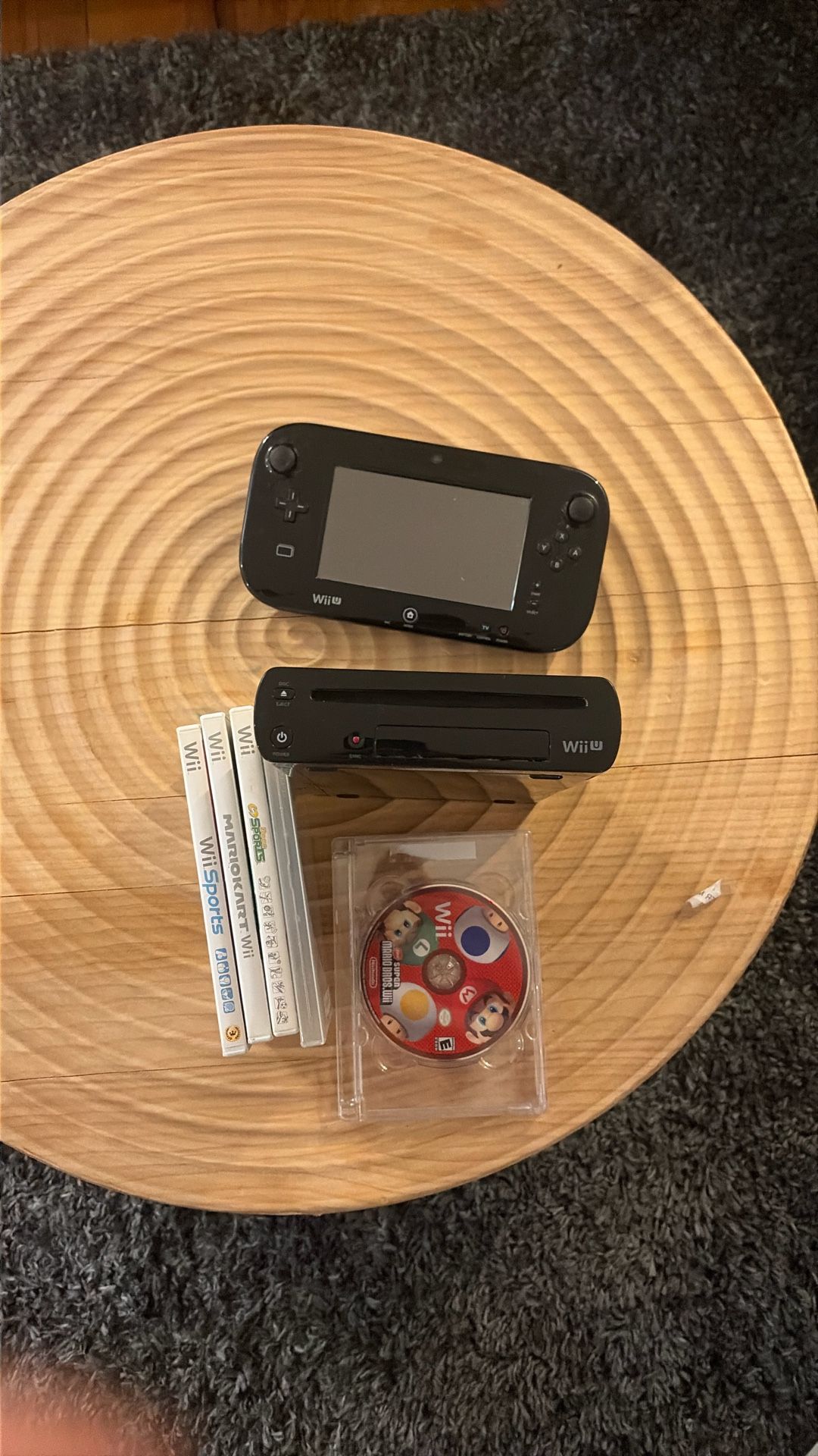 Full Wii U package with tablet, cords, 2 controllers, and sensor. Also includes the following Wii games: -super Mario bros Wii -wii sports -deca sports -Mario kart Wii Everything is used but in good condition.