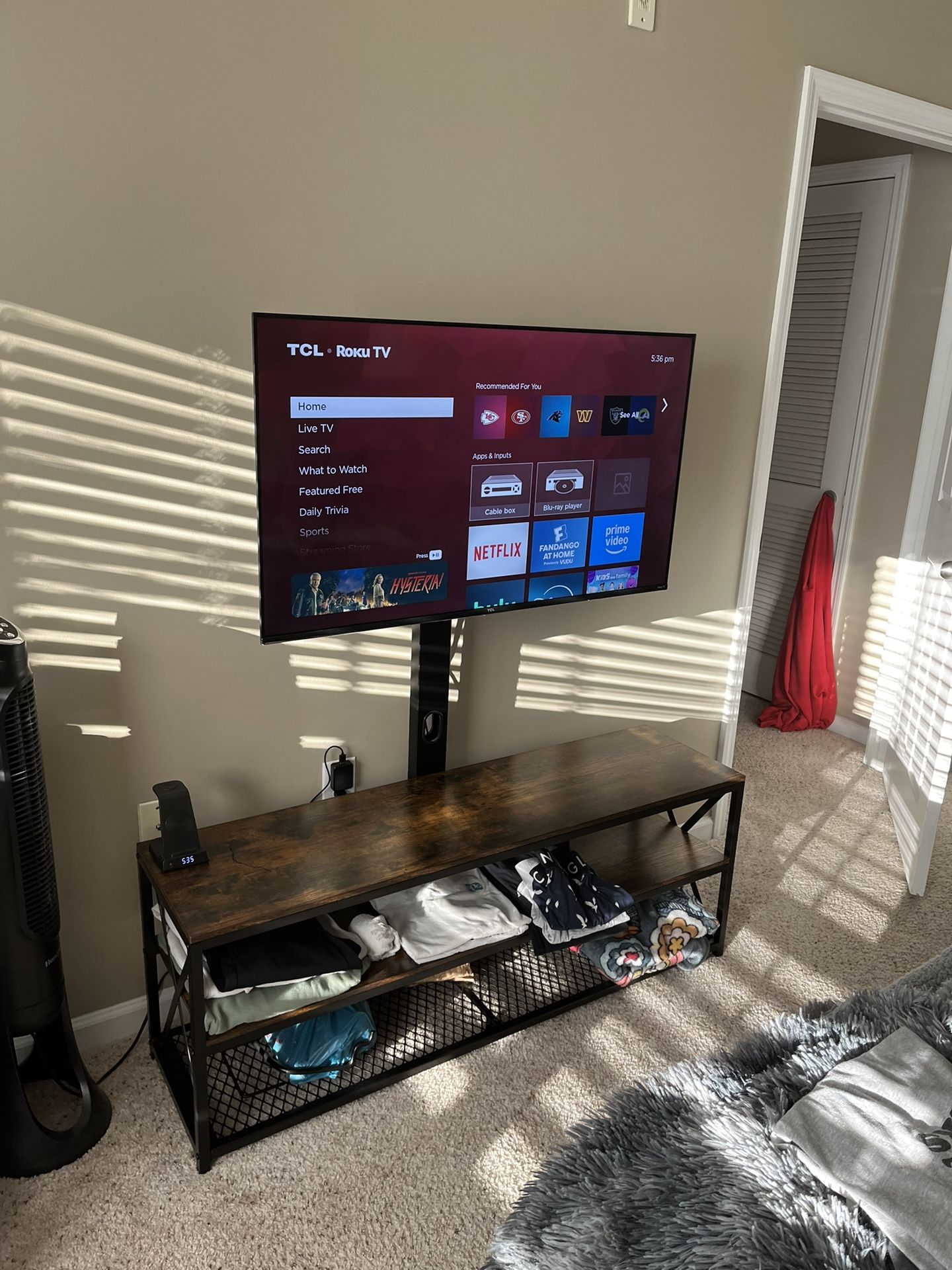 This tv stand is awesome but me and my gf are down sizing and do not need it anymore. It has a chamber to hide wires, and an electrical outlet on the shelf. You have the option to free stand the tv on it or use the mount shown in the picture. SELLING CHEAP, get it gone.