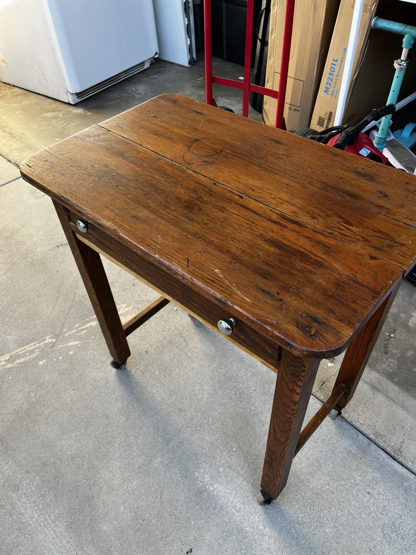 Super cool vintage wooden single student desk! Our daughter used this to do activities, arts, crafts, etc. but now we are getting rid of it due to space for a new baby. Recommend for grade school kids and not adults. Sad to see this go but still in great condition!