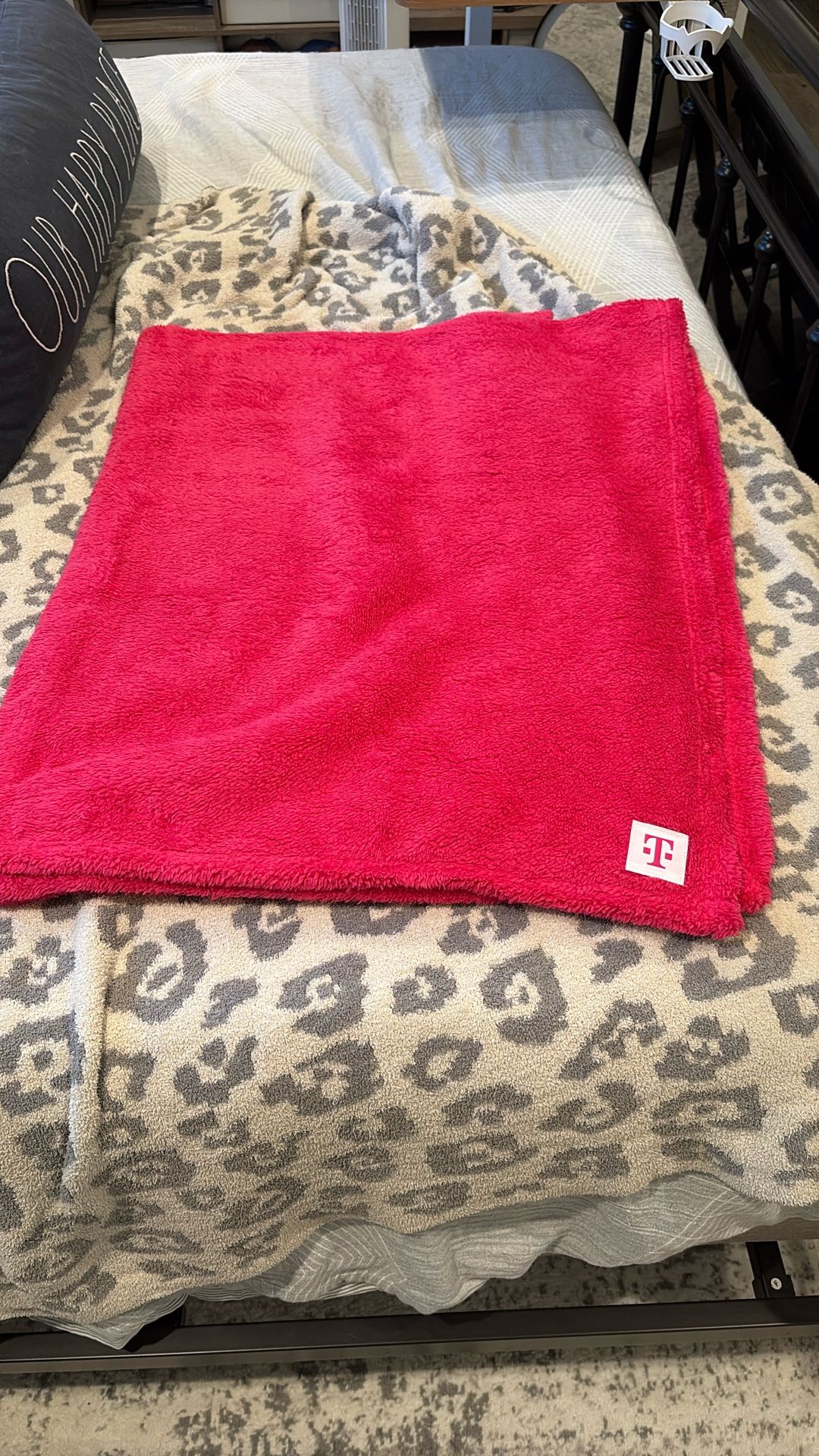Hot pink Sherpa blanket from Tmobile. Lightweight personal sized blanket.