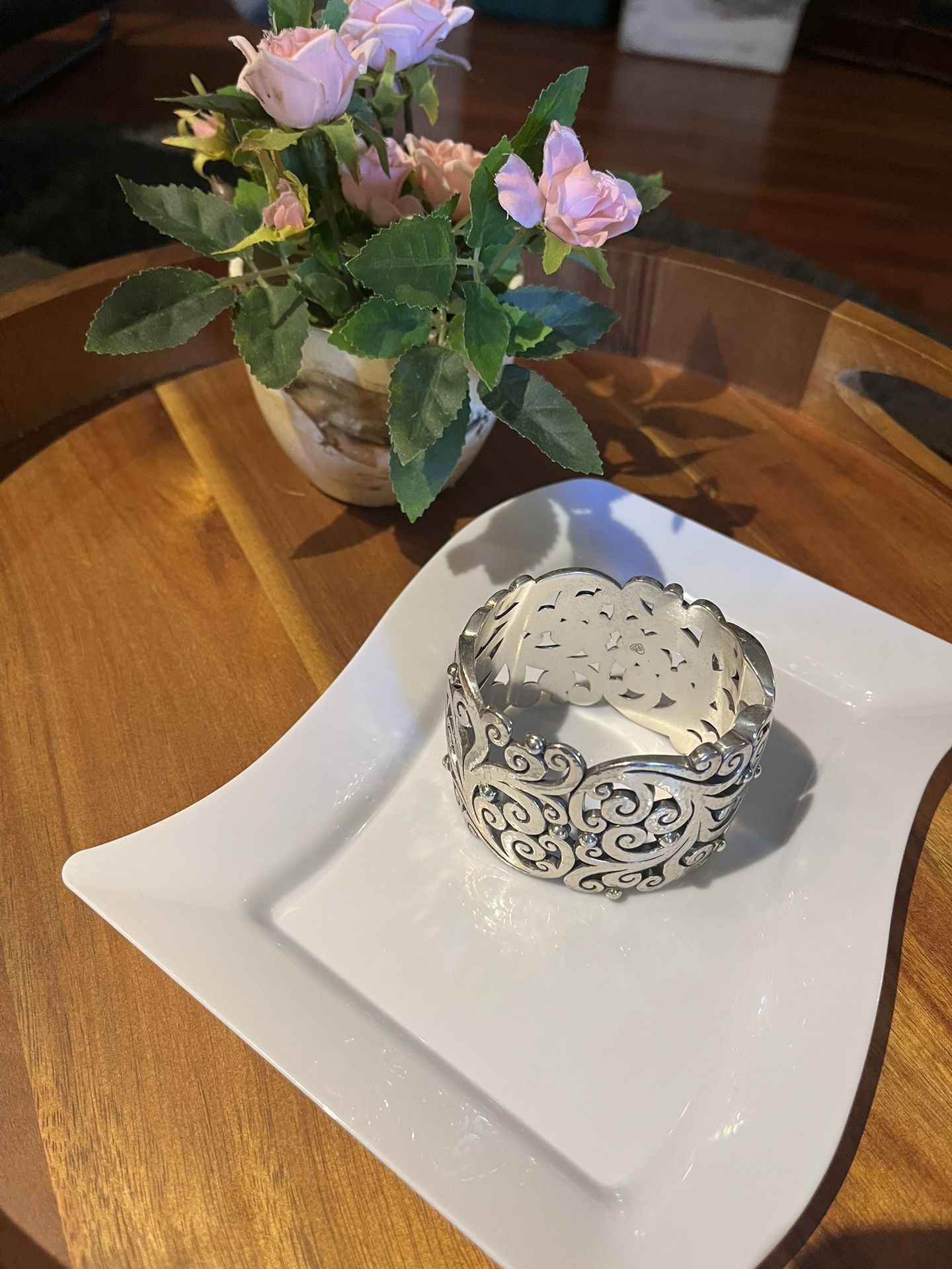 Hinged bangle bracelet featuring silver plated, scroll and open work design with hammered texture. This is a retired piece. See pictures for measurement. Excellent condition.