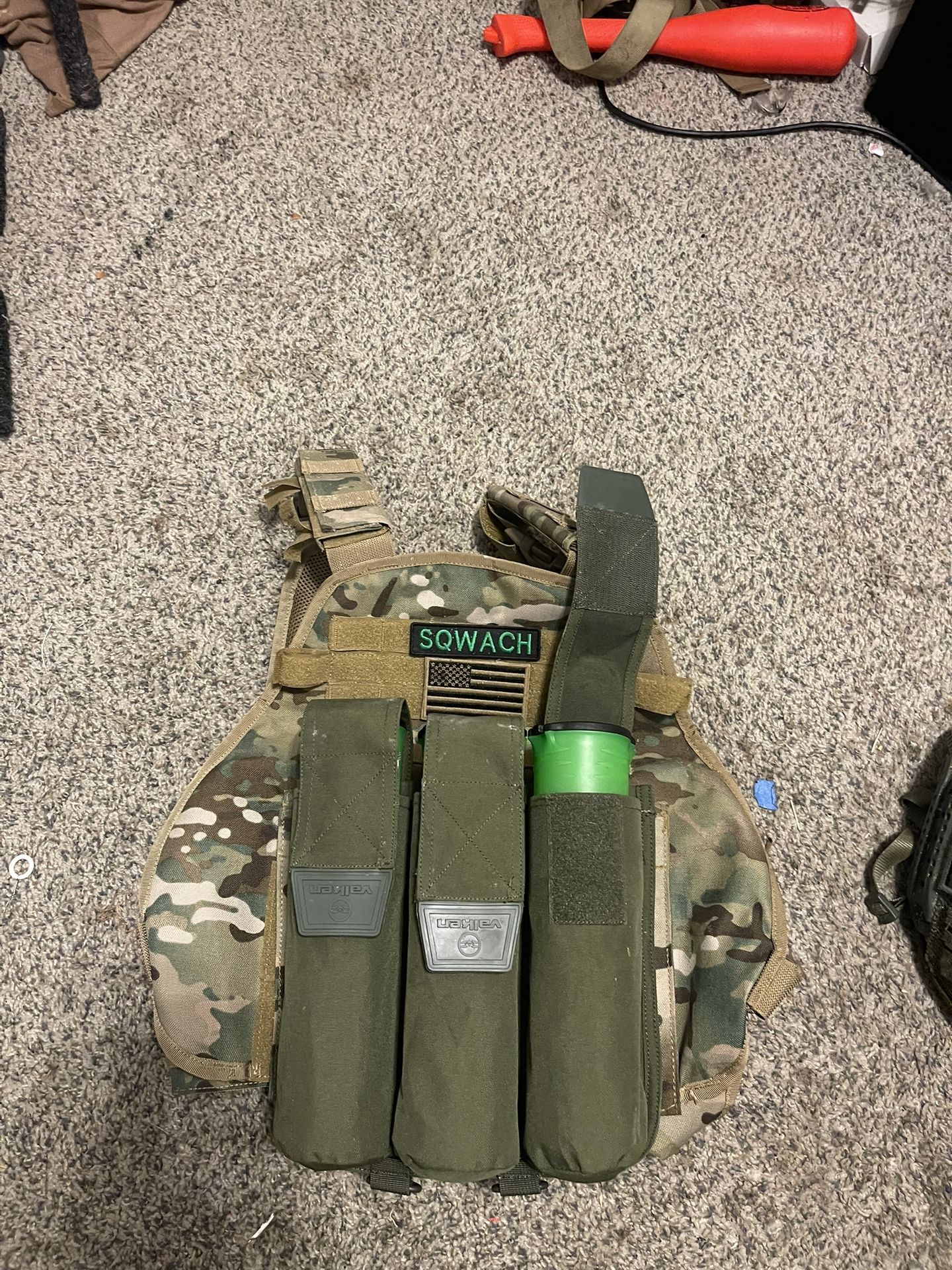 Kit has only been used for one summer. Maybe 5 games. Kit includes tactical vest, tactical helmet, two face masks, two paint tube holsters, three paint tubes, airsoft mag holster, barrel swabs, a size xxl camo athletic shirt, vest size is adjustable but meant to fit a size large and up