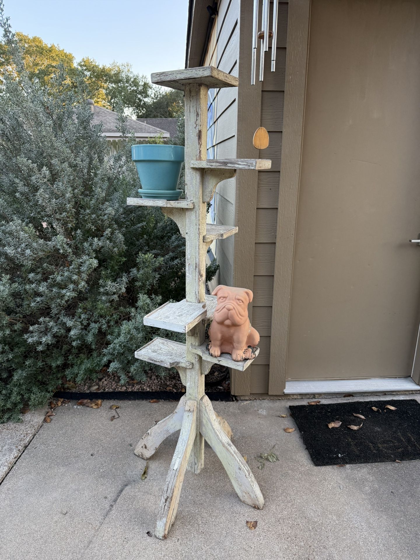 A very beautiful peace for your patio or inside. It was used for a boutique kept inside for a long time. Very special peace has an old feel but is very strong. Not to heavy easy to move.