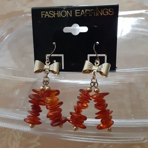 Hand made and crafted. A Pair of Natural Golden Amber Earring. Gold Tone. It was $20. Now mark down $ 17. Made from China. Company closed Collectible. 1 left.