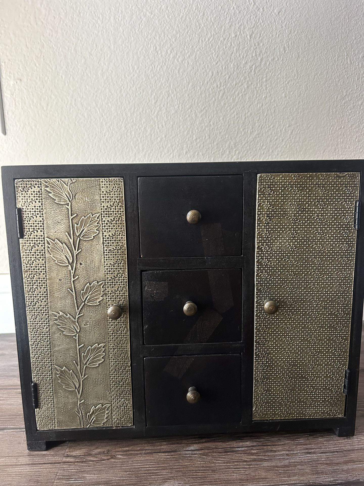 Wood and embellished brass jewelry organizer. Some wear and tear, which is shown in pictures, that could be improved with a good clean Really nice quality, heavy wood. 13in L x 5in W. Pick up Hillcrest only.