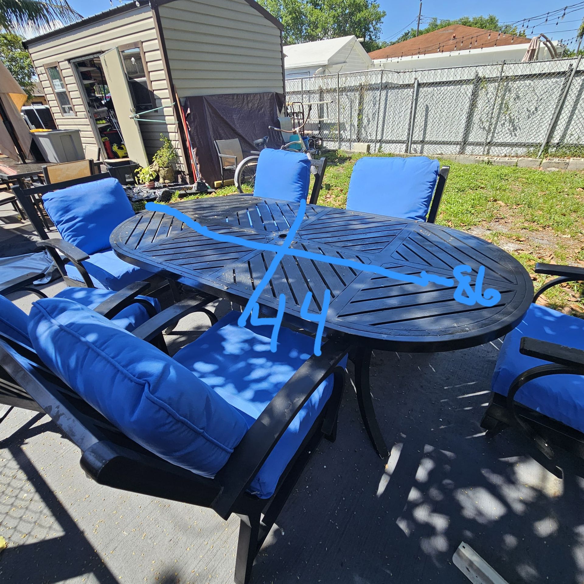 Outdoor iron patio table with six chairs and cushions. Cushions were store inside and only used a few times. Please serious inquiries only and no low offers.