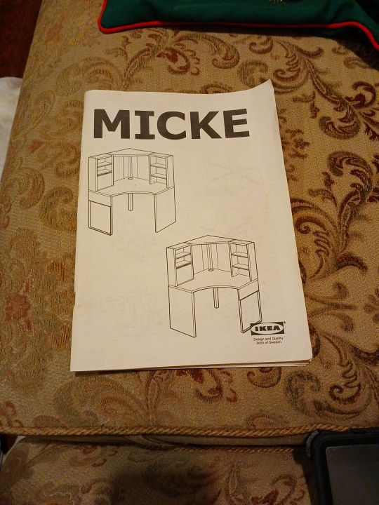 IKEA corner desk model (Micke) Dimensions L39 3/8 X W39 3/8 X H55 7/8 Desk top has a gouge on it otherwise is in good condition. I will be disassembling soon but assembly manual is available.