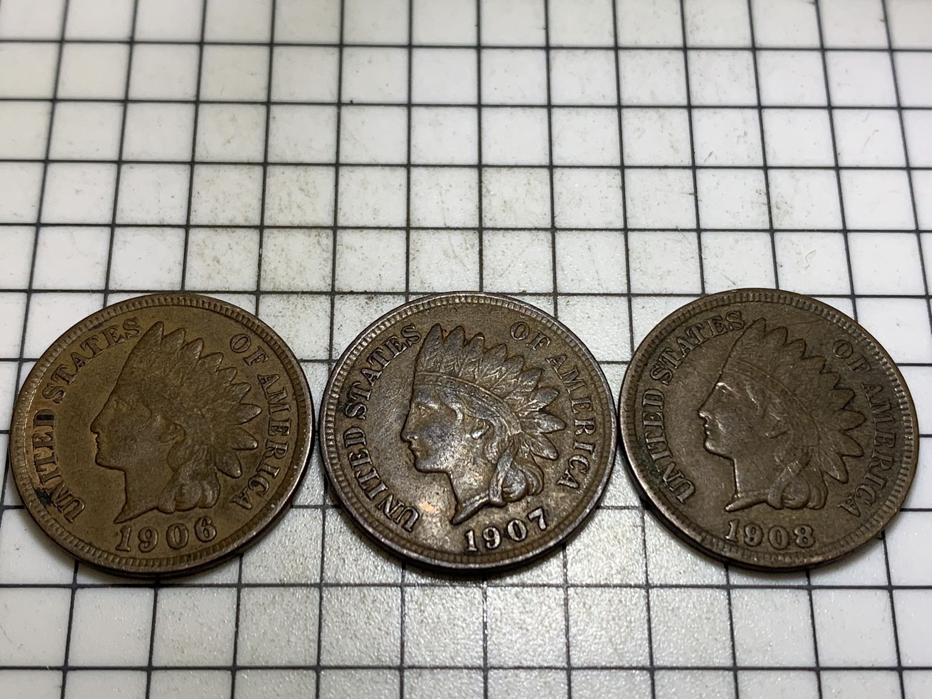 1906, 1907, 1908 Indian head pennies all with full “Liberty “ on headband