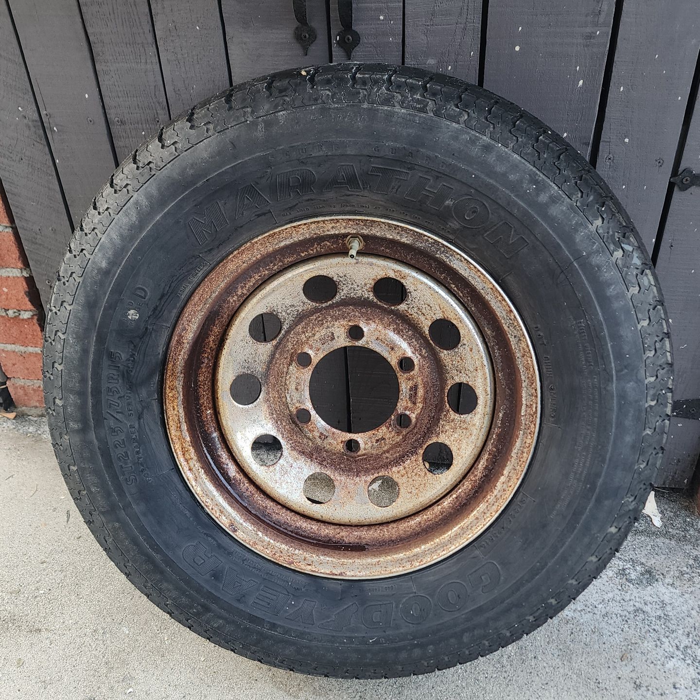 This is a Goodyear Marathon trailer wheel. It is size ST225/75R15 with an old tire. It holds air, but I havent put any weight on it. DOT tag says it's from September of 2007. I found it in an abandoned storage unit in a tied up plastic bag. See pictures for best description.