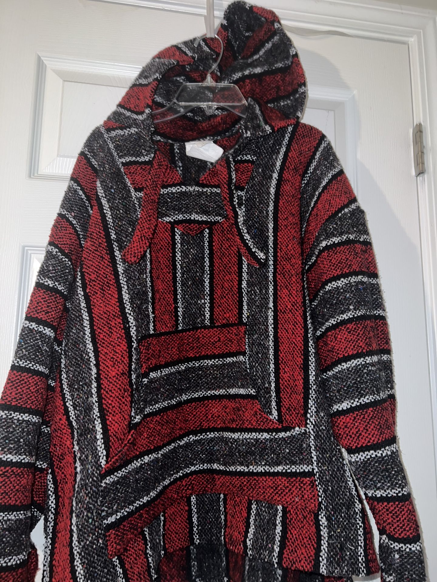 Del Mex Mexican Baja Hoodie Hippie Surf Poncho Sweater Large Red/Gray