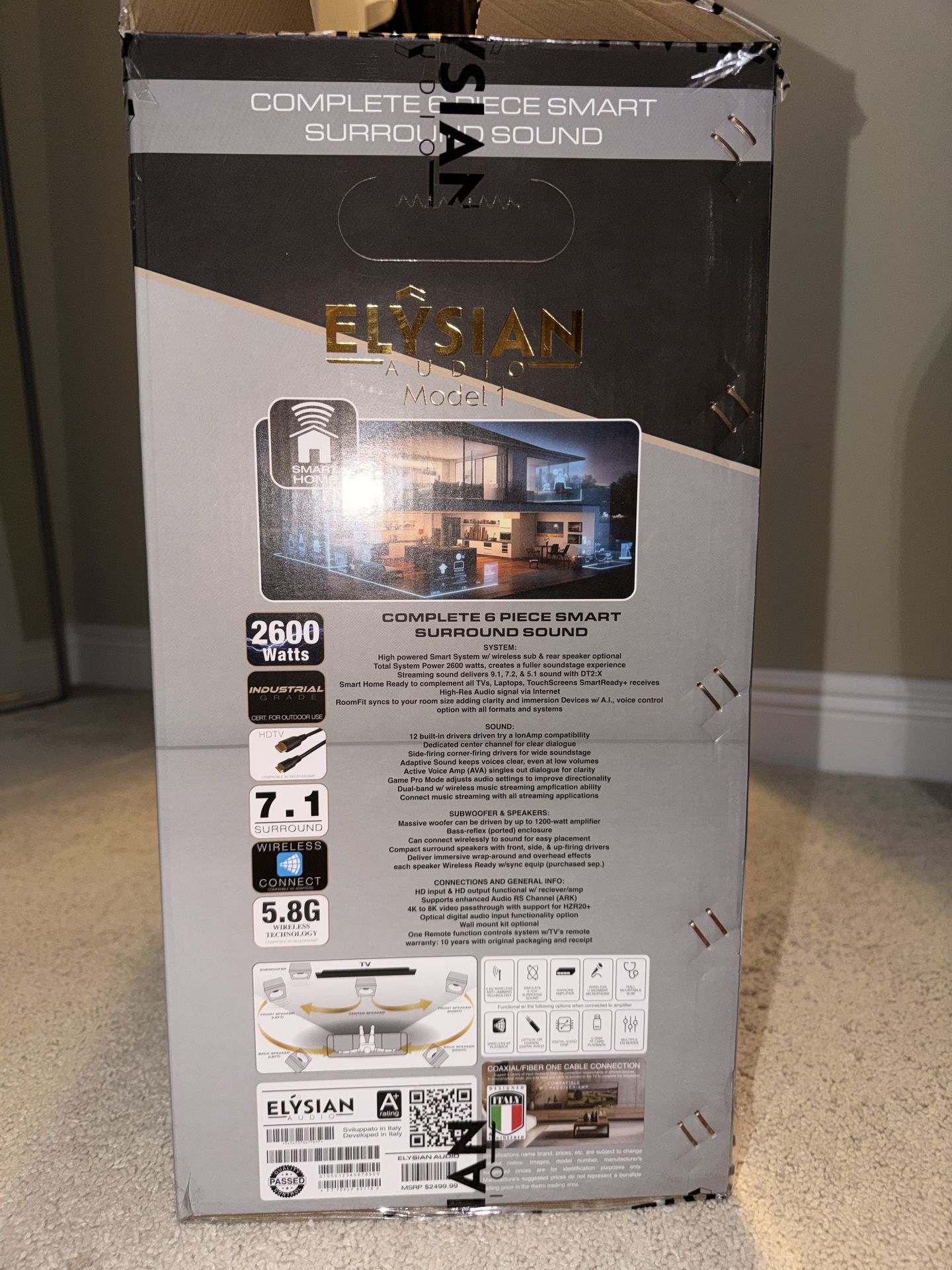 Elysian Audio 6-piece smart surround system (7.1). Only tested, never installed. • 2600 watts • Wireless surround • Sub + center + speakers • Original box