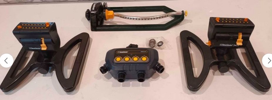Melnor lawn and garden watering items. One zone Bluetooth timer, two mini oscillator sprinklers and one oscillating sprinkler with 15 precision nozzles.