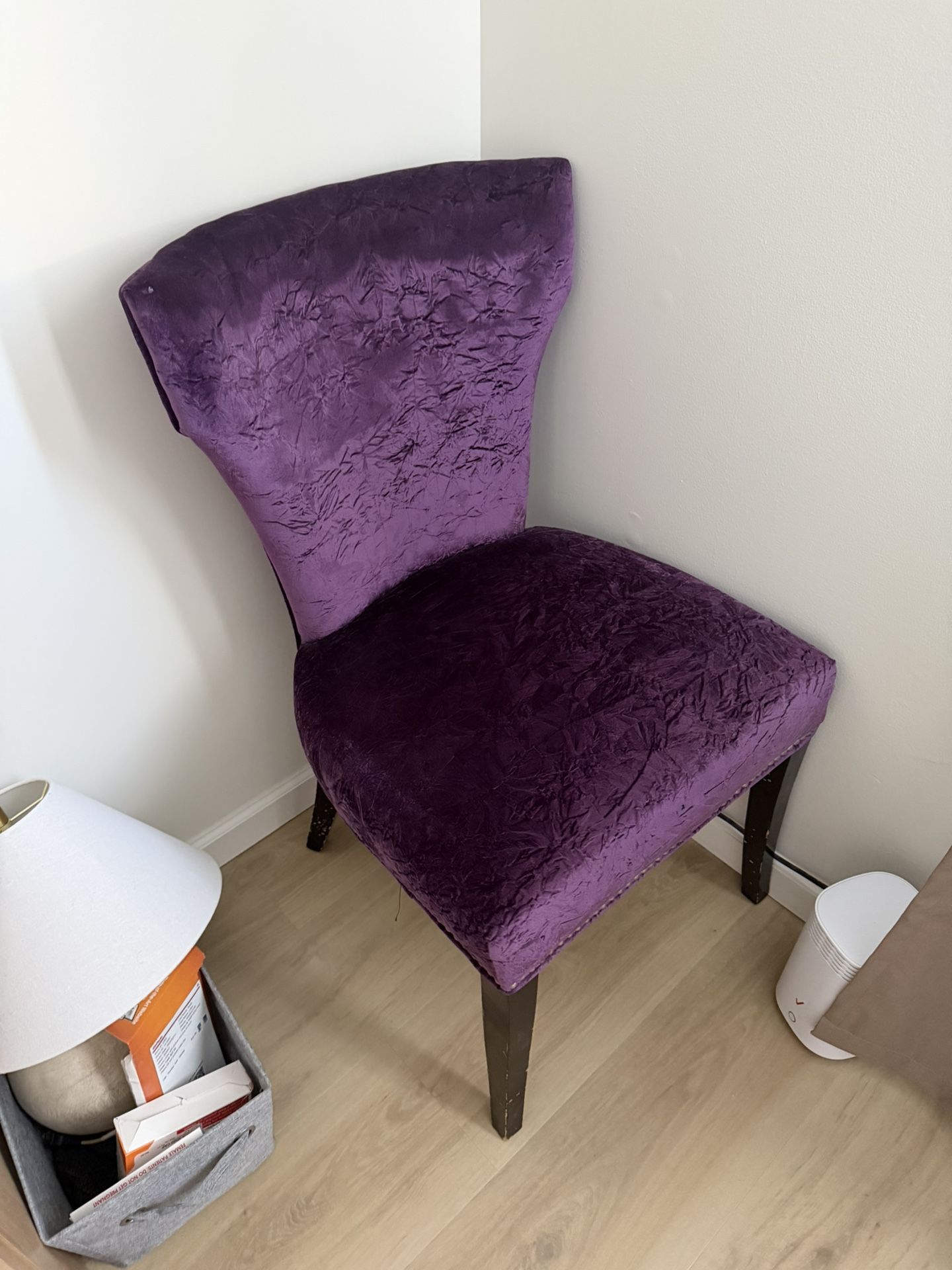 Velvet purple chair with studded line on the base. Scruffed up marks on legs of chair