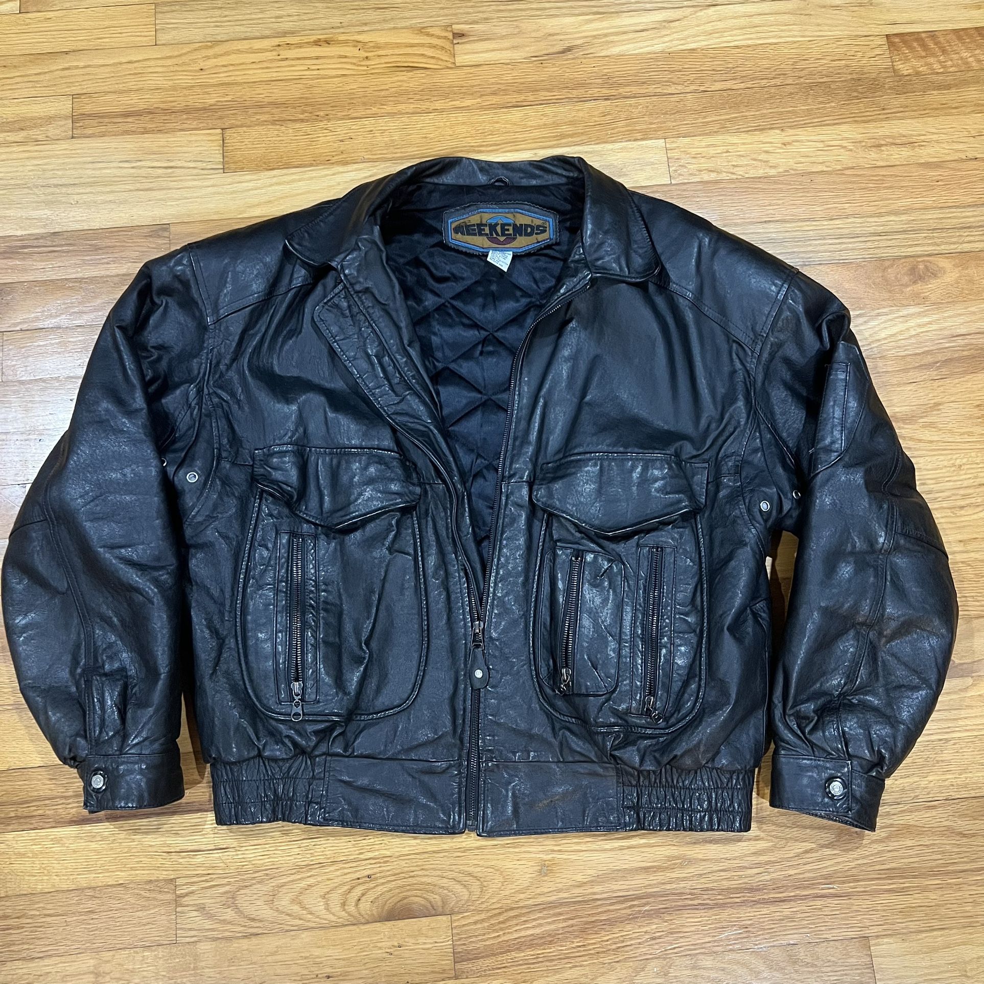 WEEKENDS boxy black leather bomber jacket with quilted lining and multiple pockets