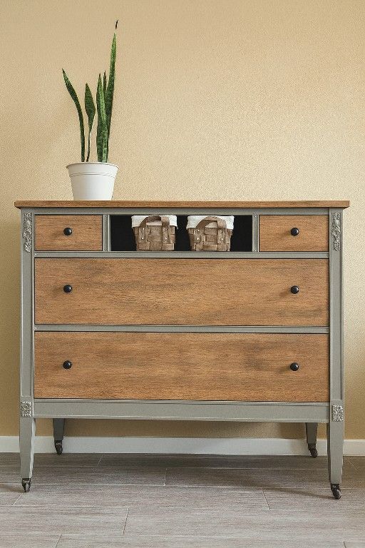 Restored vintage dresser from the 1930s with solid wood drawers, original casters, and a functional center storage cubby. Finished in a soft taupe tone (may appear more gray in photos), with drawer fronts and top refinished in natural wood. The center cubby was originally a drawer (missing when acquired); a custom interior wood base was added for storage. New hardware. Includes two matching storage baskets. All drawers open and close smoothly. Measurements: 42” L x 20” W x 37” H Pickup location 92114 area Delivery available if needed