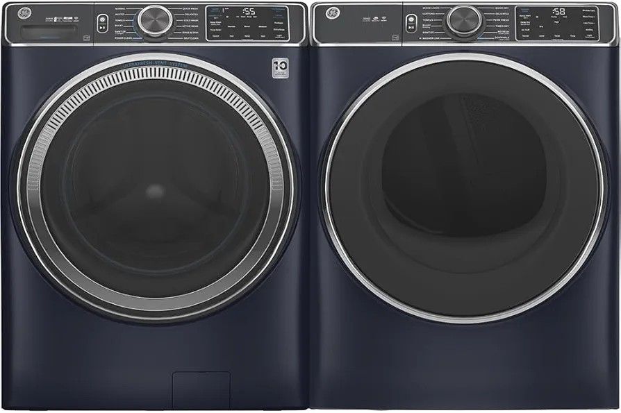 GE - 5.0 Cu Ft High- Eficiency Stackable Smart Front Load Washer w/UltraFresh Vent, Microban Antimicrobial & 1-Step Wash+Dry Sapphire Blue Dimensions: 34"D x 28"W x 39.75"H GE -7.8 Cu. Ft. 12-Cycle Electric Dryer with Steam - Sapphire Blue Dimensions: 32"D x 28"W x 39.75"H Current retail $850 each Selling together. 1 year used. Both work great. Just moved and don't need them any more.