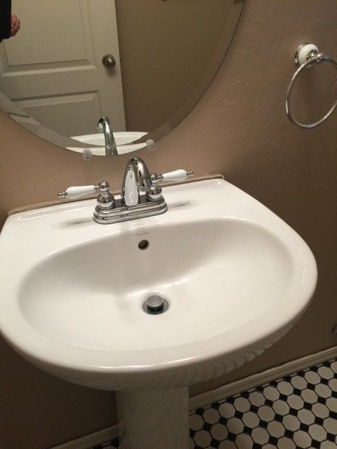 Sterling (made by Kohler) pedestal sink. White, 3 hole center set sink with overflow hole. Lightly used! From infrequently used powder room. Faucet has no issues. Sink costs over $200 new, and faucets are generally $40-200 new.