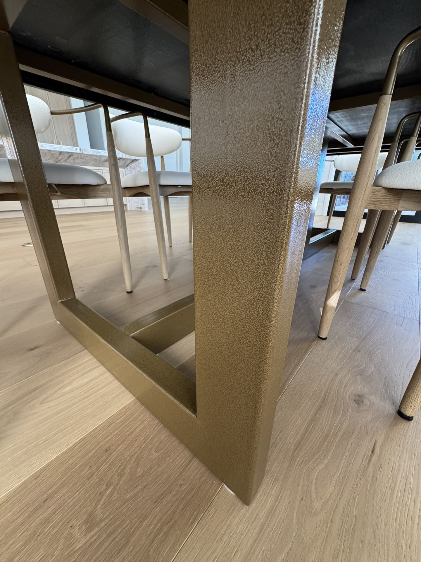 Black Quartzite Dining Table – Custom Made A stunning custom-made dining table crafted from luxurious black quartzite with a refined leather finish. Designed to comfortably seat up to 10 people, this statement piece combines timeless elegance with modern strength. The table features a robust steel base with a textured finish, adding both durability and a sophisticated architectural look. The tabletop shape, dimensions, and leg design can be fully customized, with multiple color options available to suit your interior style. Chairs shown are for display purposes only and are not included.