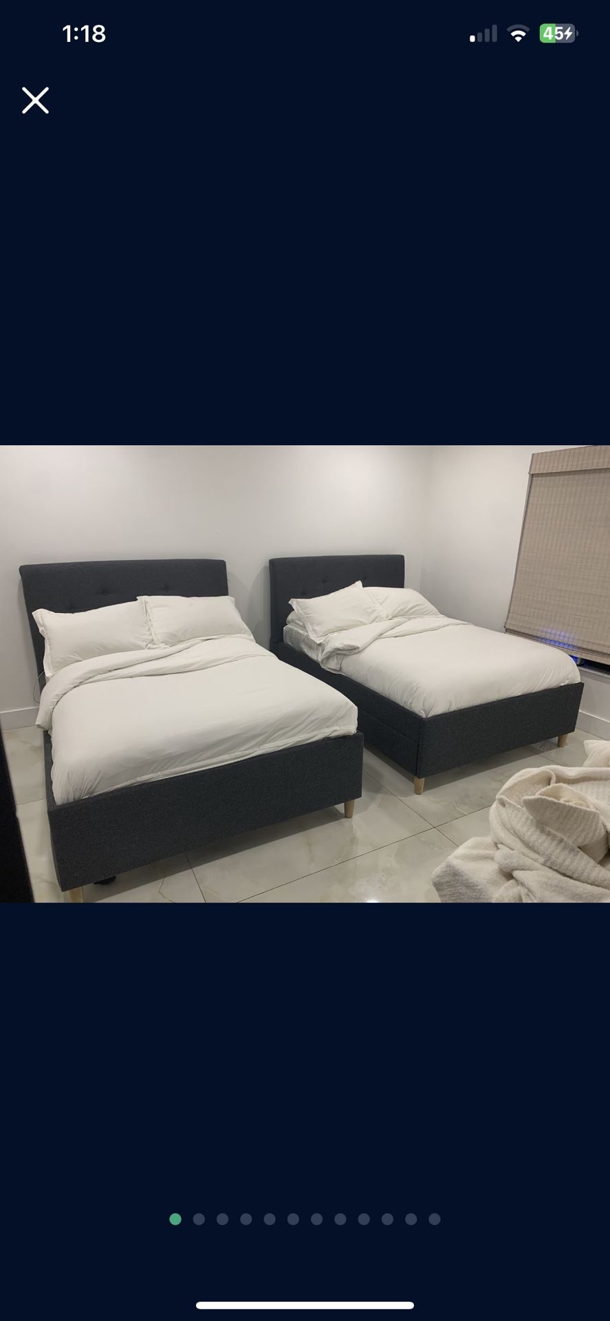Good condition from ikea moving so need to get rid of them dark grey HEAVY DUTY have 2 large drawers on both sides great storage nice headboard IF INTERESTED MESSAGE NEEDS TO GO FAST size of bed if full 1 bed for 500 2 for 1000 trying to sell ideally both of them same time price negotiable but has to be reasonable