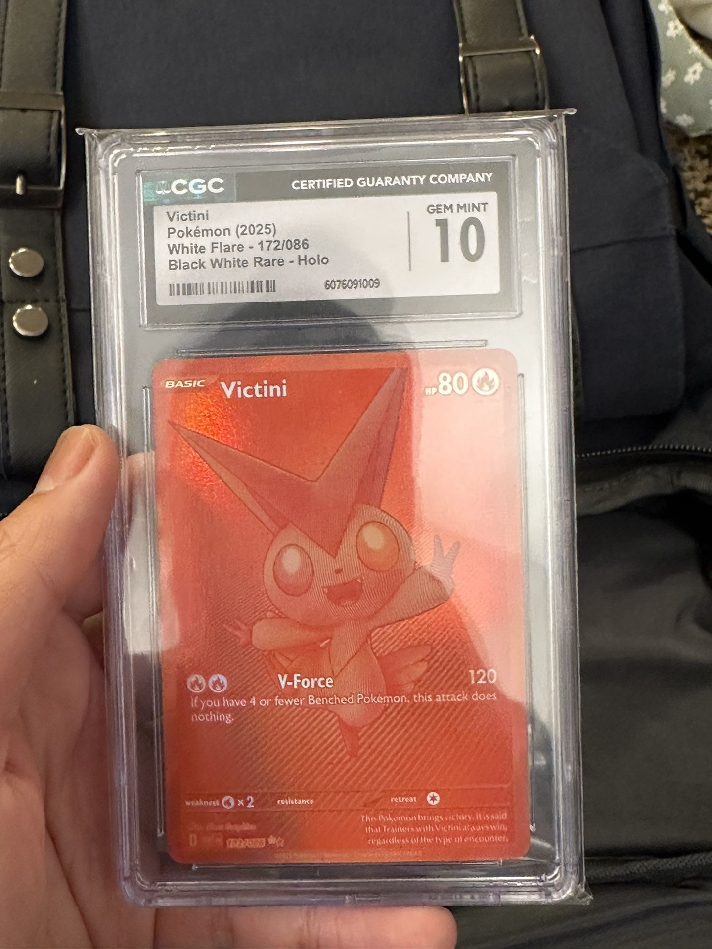 Graded Victini Pokemon card. CGC Gem Mint 10. Card is from the White Flare set, number 172/086. It is a Black White Rare Holo. Super cool red card. Comes in its sealed CGC case. Open to trades for other pokemon cards or product lmk!