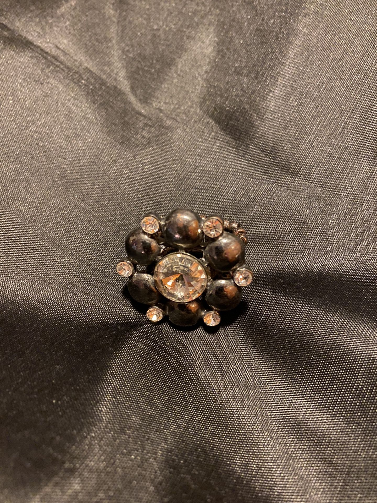 For the flower stretch ring Statement piece. Large rhinestone flower stretch ring One size fits most. 6 dark silver/black petals surrounded by 6 clear gemstones, with one large clear stone in the middle. Band Is silver. Slightly tarnished, but adds to the unique look of this piece. Pictures don’t do it justice.