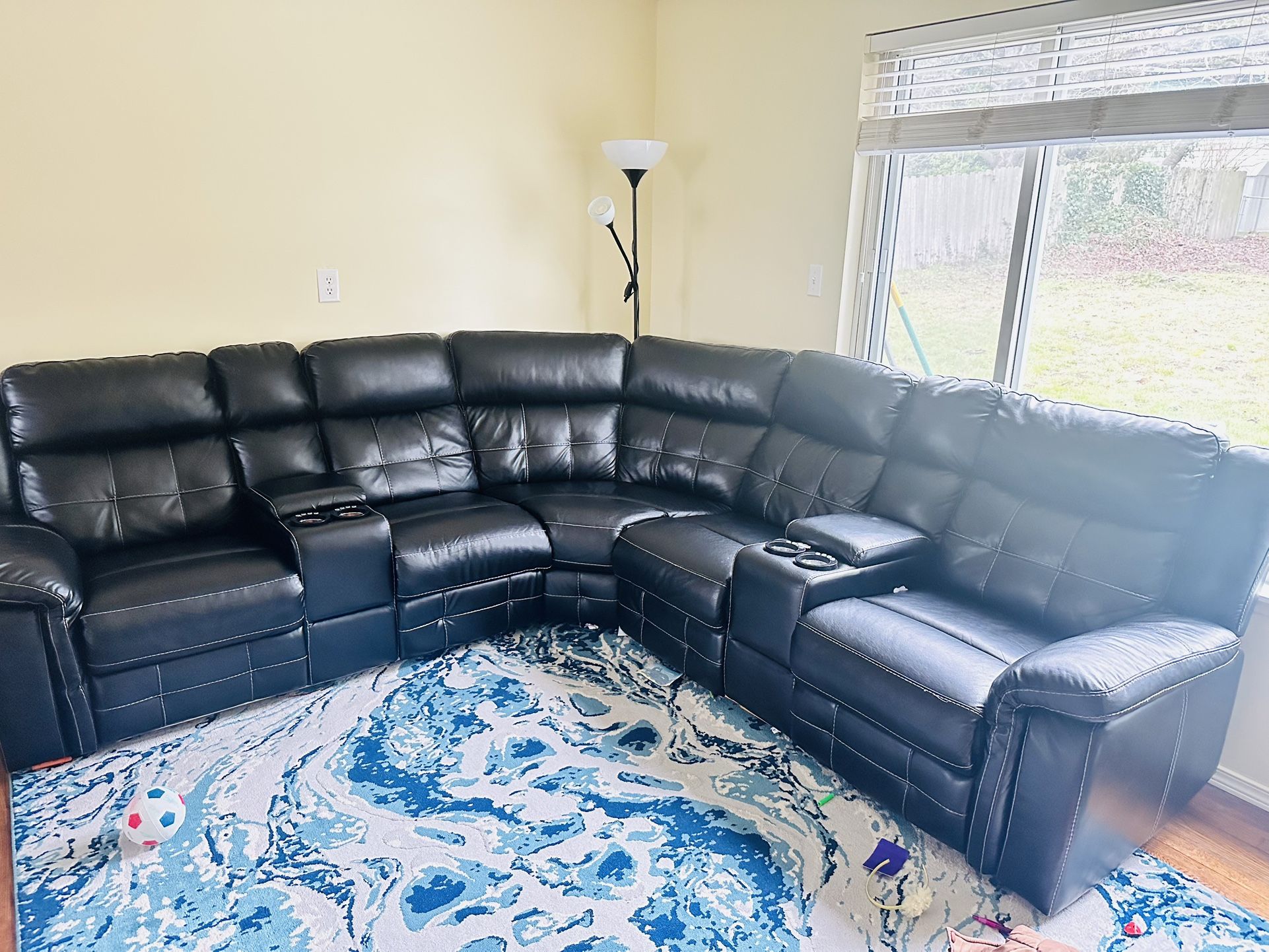 5 seat power reclining couch, all recliners and led lights work. Minor tear on the corner of 1 arm rest(fixable, will provide matching shade adhesive leather roll).