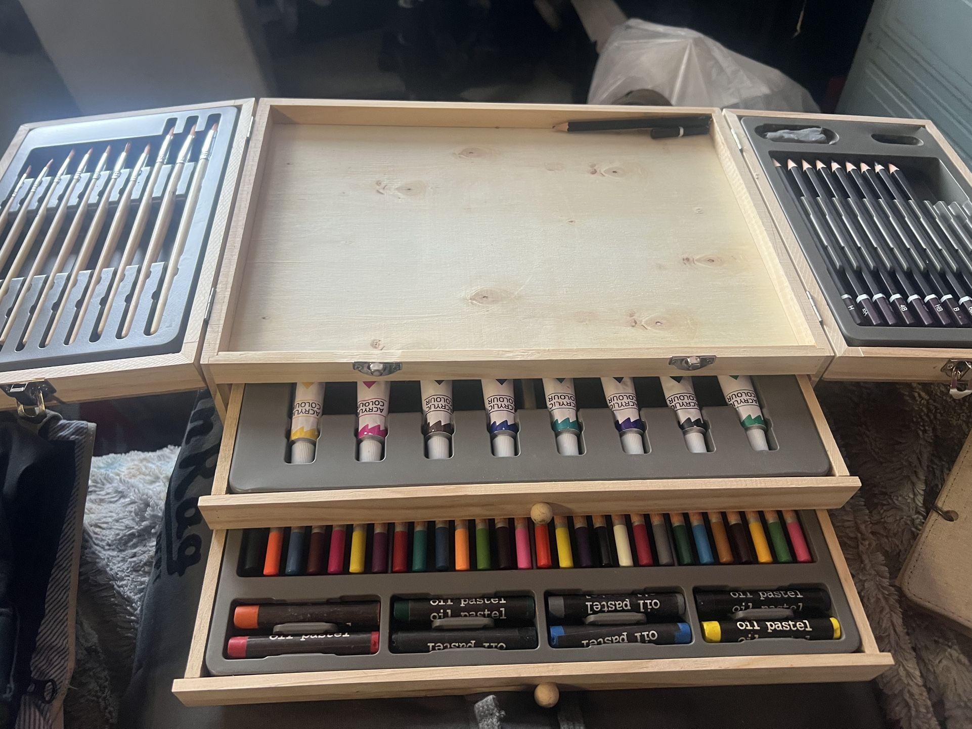 Large wooden artist case with multiple drawers. Includes graphite pencils, colored pencils, oil pastels, and more. Perfect for artists, students, or hobbyists. Condition: Gently used, all supplies included, except 2 pencils missing and one broken. Quality wooden construction with clasp closures. Downsizing art supplies. $35 (retail $100+) Cash only. Pickup near Indian Truck Trail exit off the I-15 (92883).