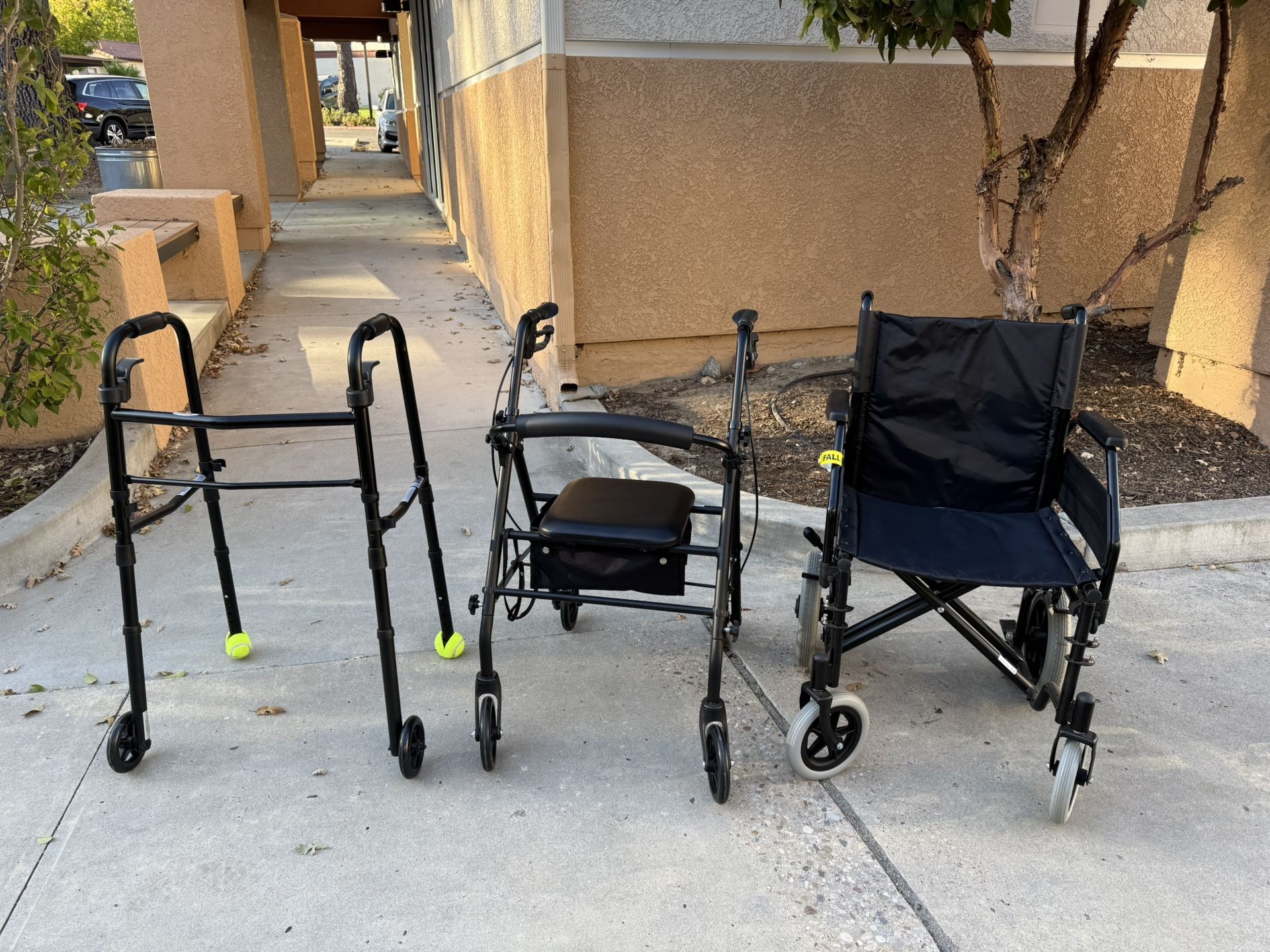 Items like New only used once. Pick up in Templeton Wheelchair 120 Sit down, walk with chair 100 Stand-up walker 50 Or ALL 3 for $200 CASH ONLY