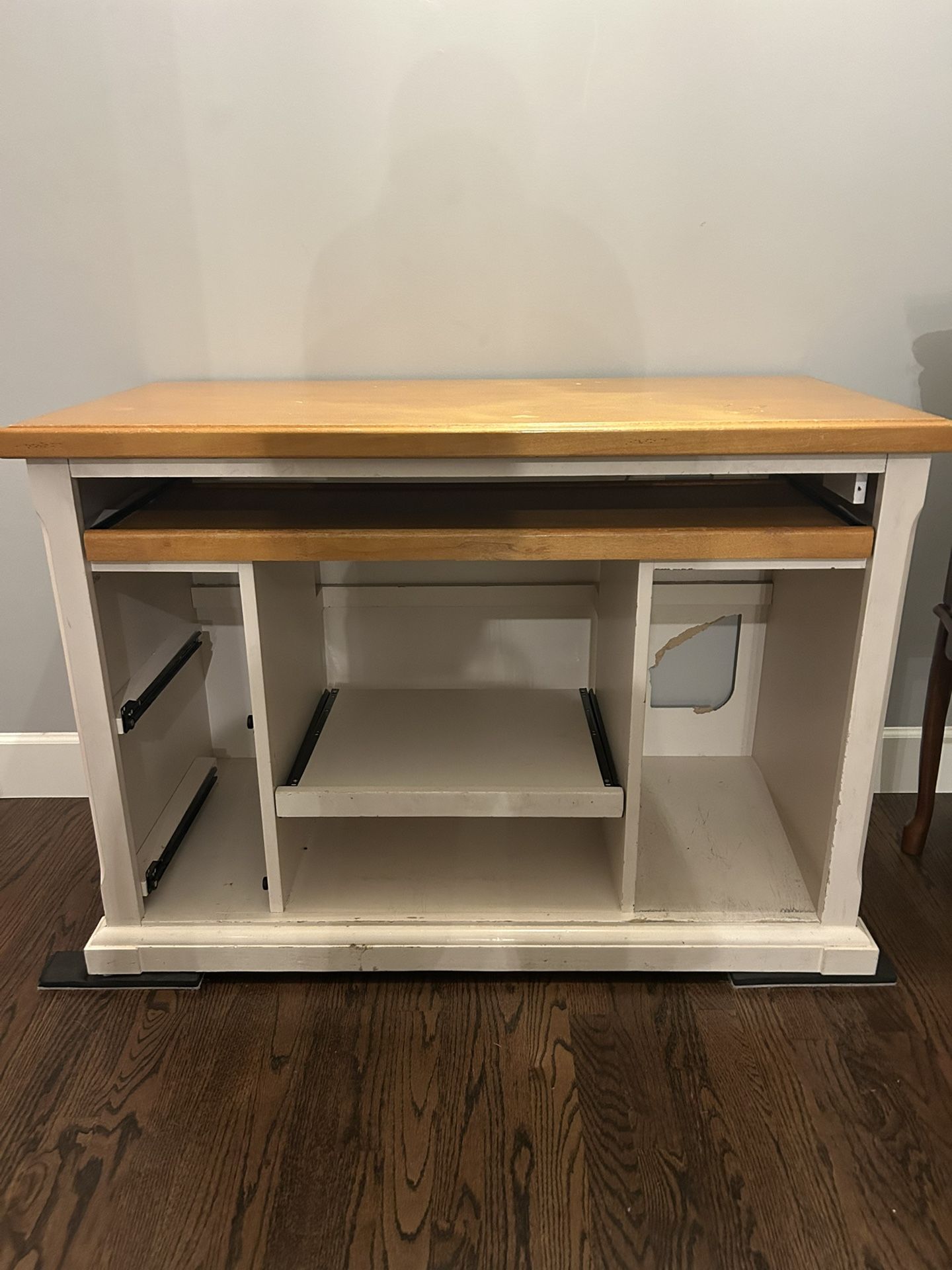 Solid desk 30” height (has keyboard tray) 21” deep 43” wide Has some scratches on top surface. Still in great condition.